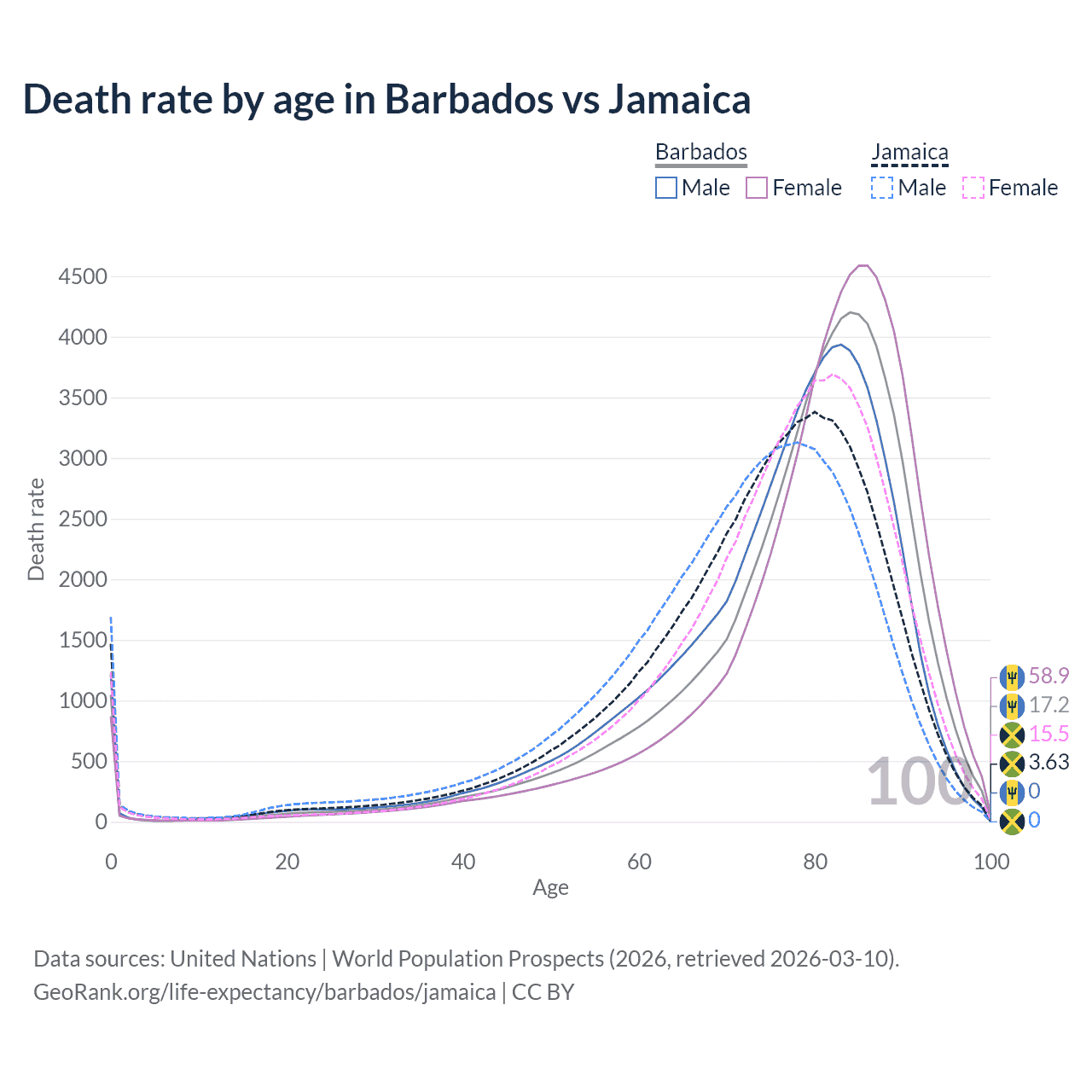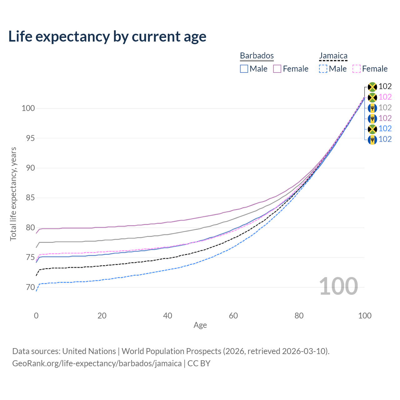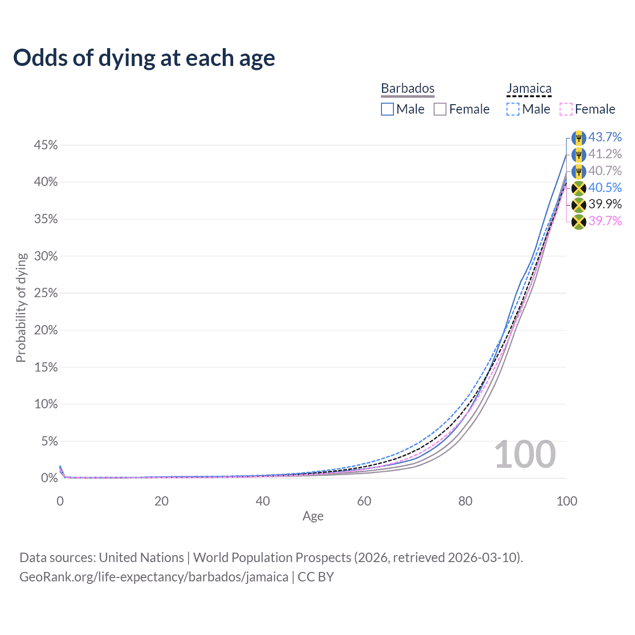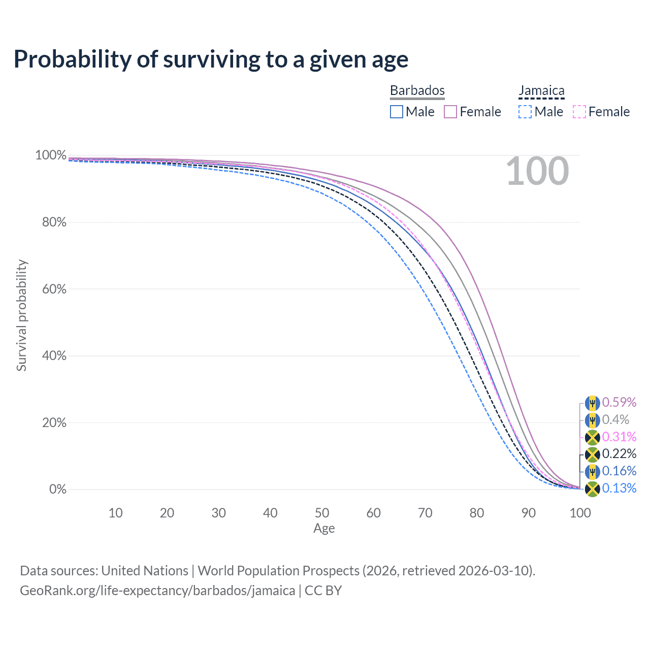 This life expectancy calculator shows the odds of living to 100, 95, 90, and below based on current age for both males and females in Barbados and Jamaica, along with mean and median age of death. The calculations are based on the 2026 life tables (actuarial tables) from the UN World Population Prospects.