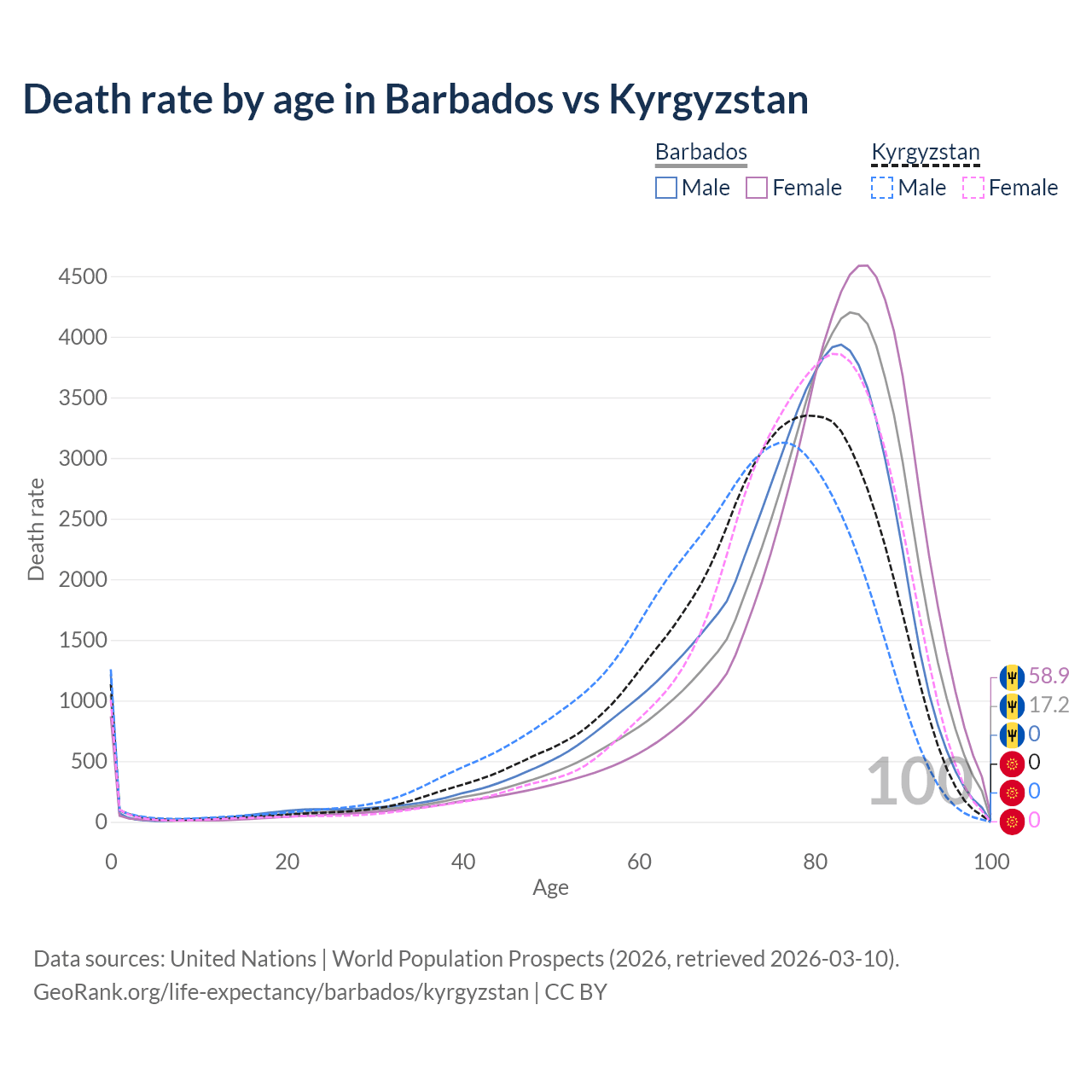 In Barbados, the most common age of death is 84, compared to 79 in Kyrgyzstan. The median age of death is 80.8 in Barbados and 75.6 in Kyrgyzstan, meaning only half of each cohort is expected to live past that age.