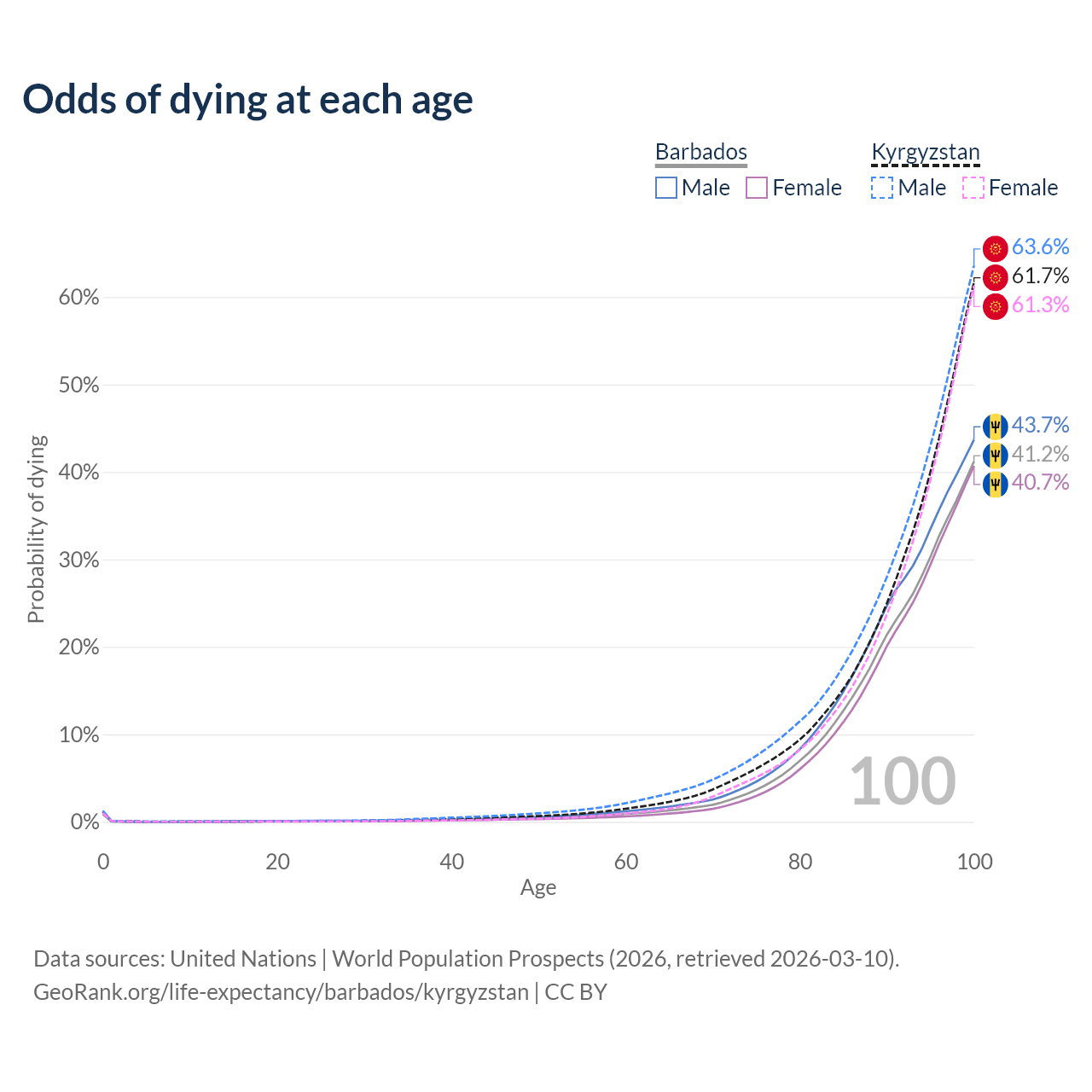 This life expectancy calculator shows the odds of living to 100, 95, 90, and below based on current age for both males and females in Barbados and Kyrgyzstan, along with mean and median age of death. The calculations are based on the 2026 life tables (actuarial tables) from the UN World Population Prospects.