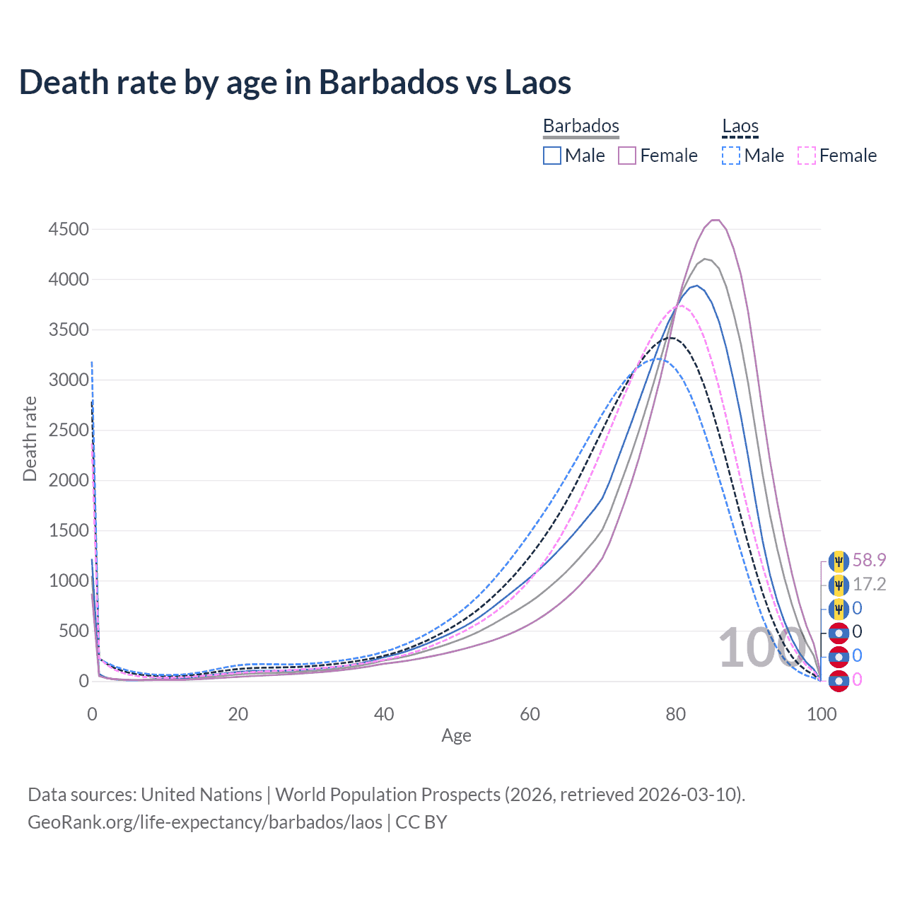 In Barbados, the most common age of death is 84, compared to 79 in Laos. The median age of death is 80.8 in Barbados and 74.7 in Laos, meaning only half of each cohort is expected to live past that age.