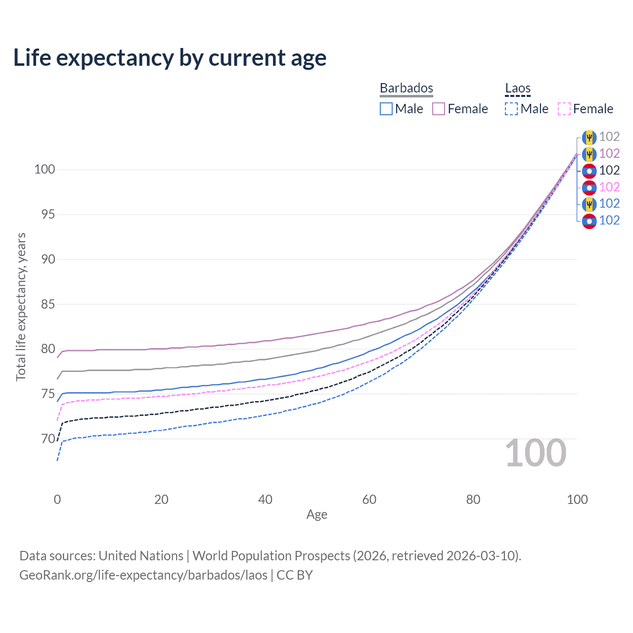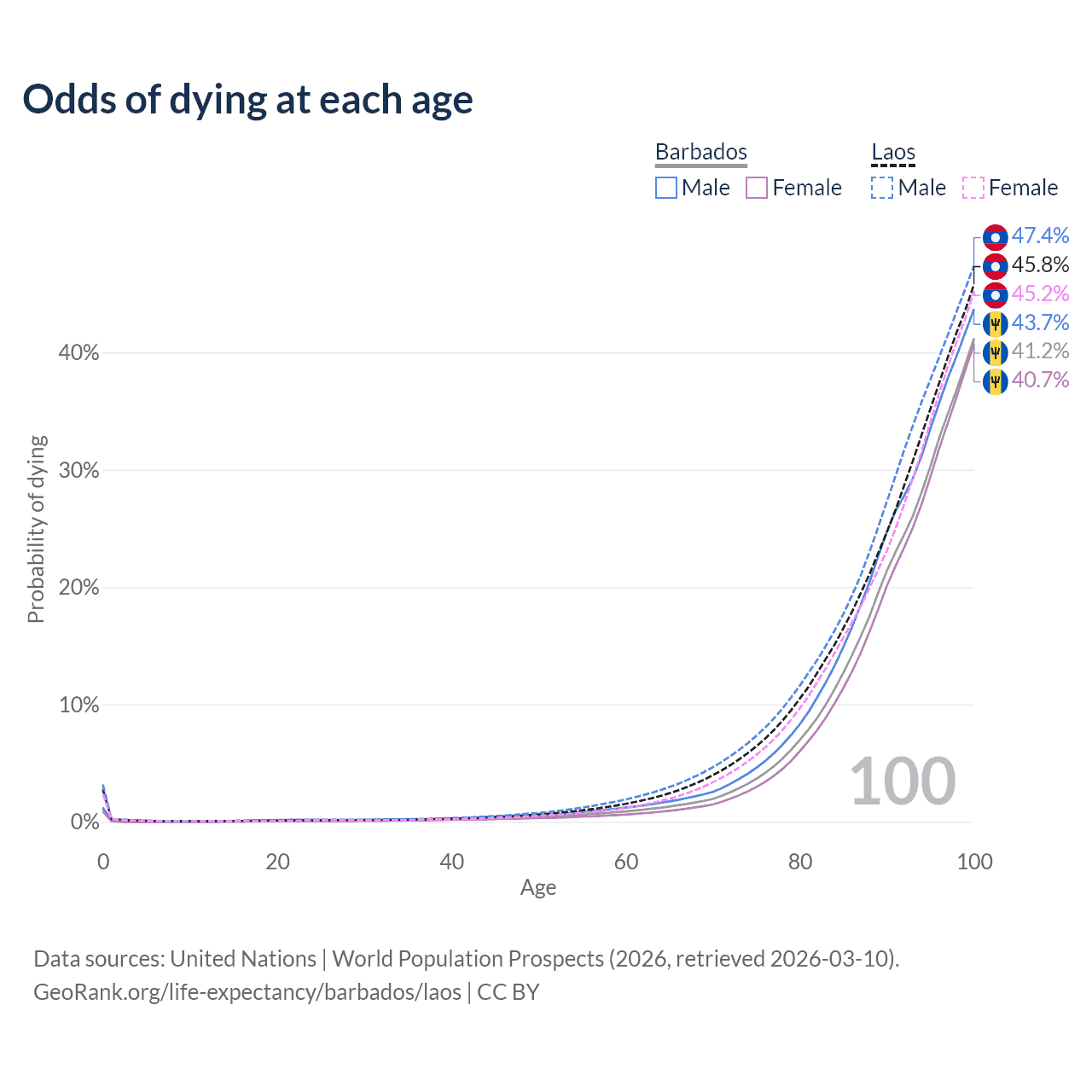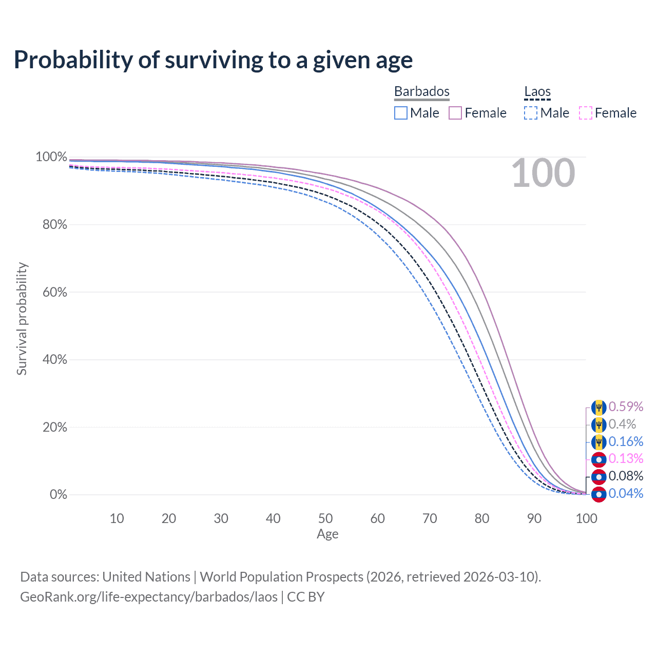 This life expectancy calculator shows the odds of living to 100, 95, 90, and below based on current age for both males and females in Barbados and Laos, along with mean and median age of death. The calculations are based on the 2026 life tables (actuarial tables) from the UN World Population Prospects.