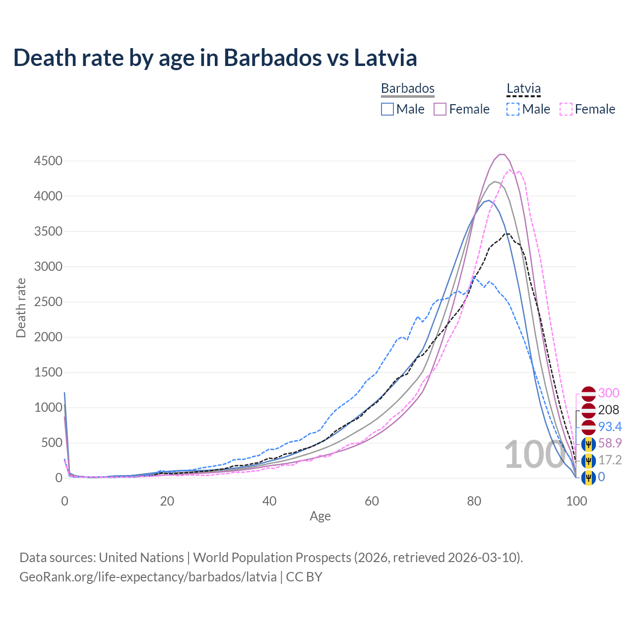 In Barbados, the most common age of death is 84, compared to 87 in Latvia. The median age of death is 80.8 in Barbados and 80.4 in Latvia, meaning only half of each cohort is expected to live past that age.