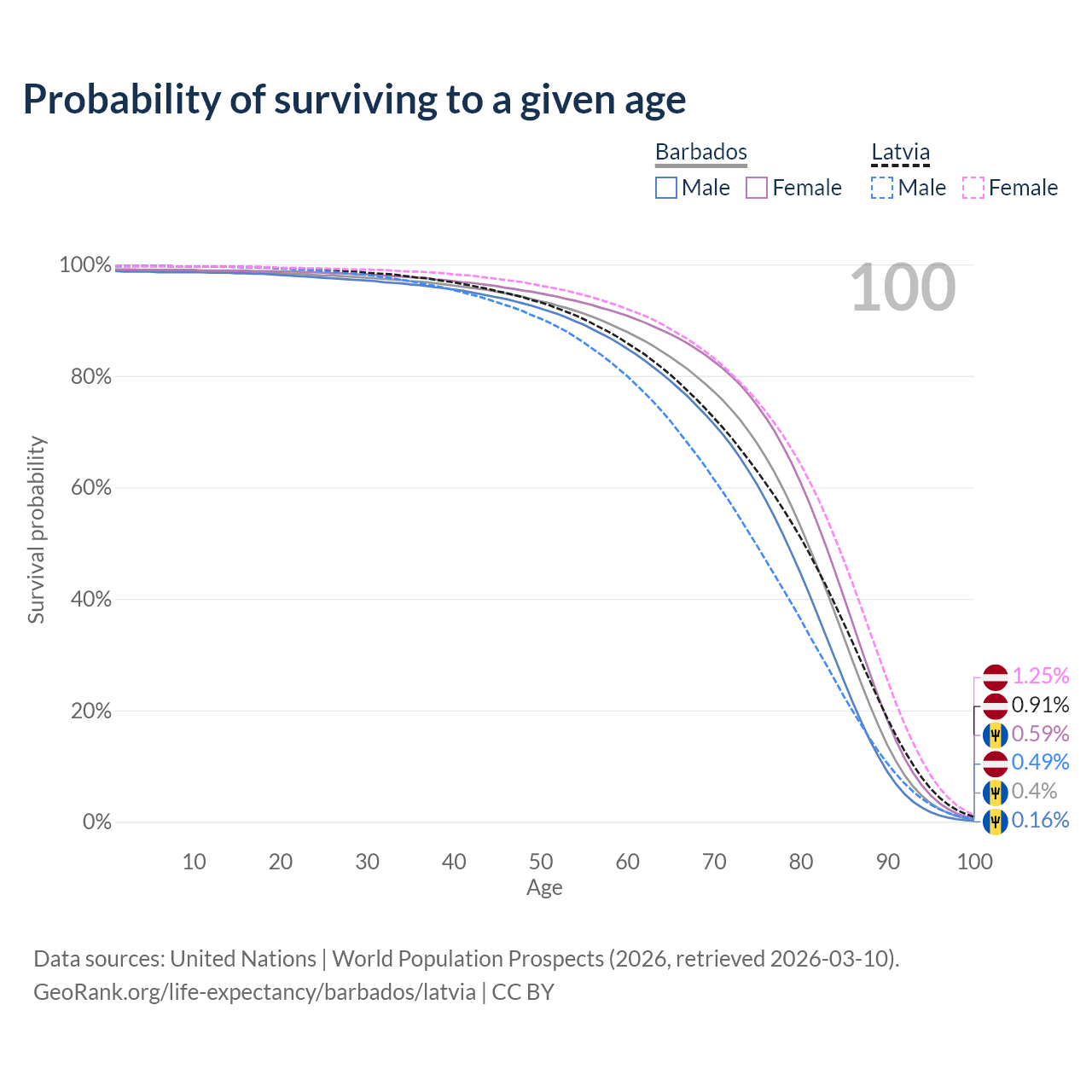 This life expectancy calculator shows the odds of living to 100, 95, 90, and below based on current age for both males and females in Barbados and Latvia, along with mean and median age of death. The calculations are based on the 2026 life tables (actuarial tables) from the UN World Population Prospects.
