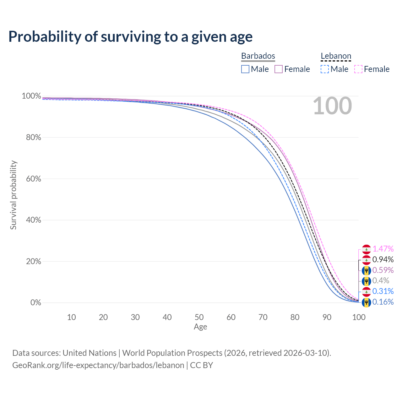 This life expectancy calculator shows the odds of living to 100, 95, 90, and below based on current age for both males and females in Barbados and Lebanon, along with mean and median age of death. The calculations are based on the 2026 life tables (actuarial tables) from the UN World Population Prospects.
