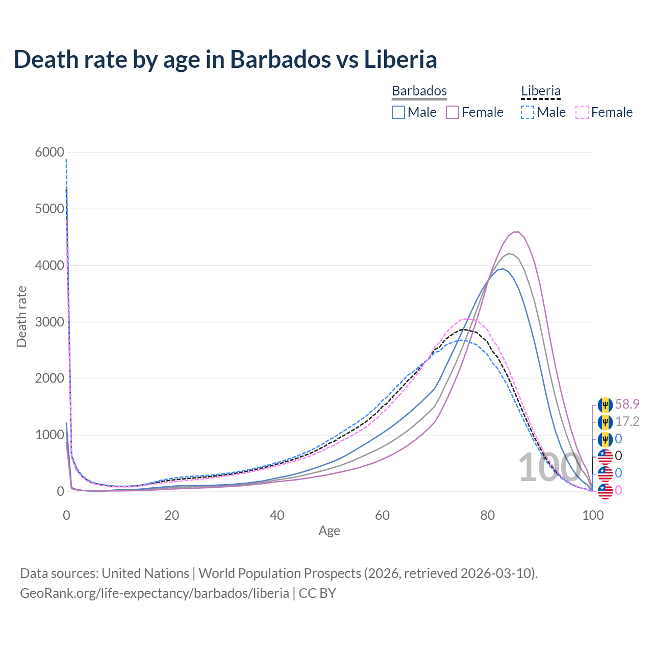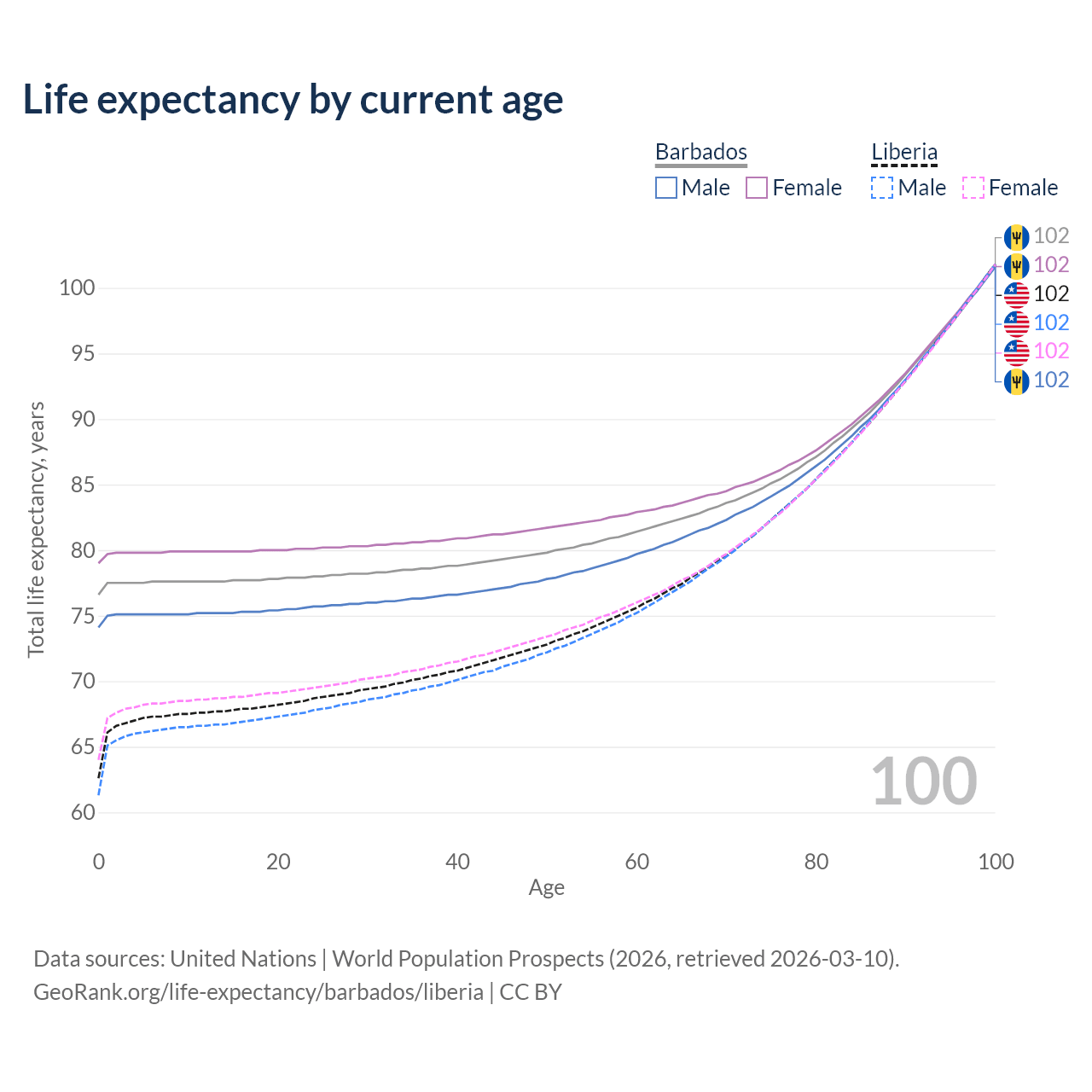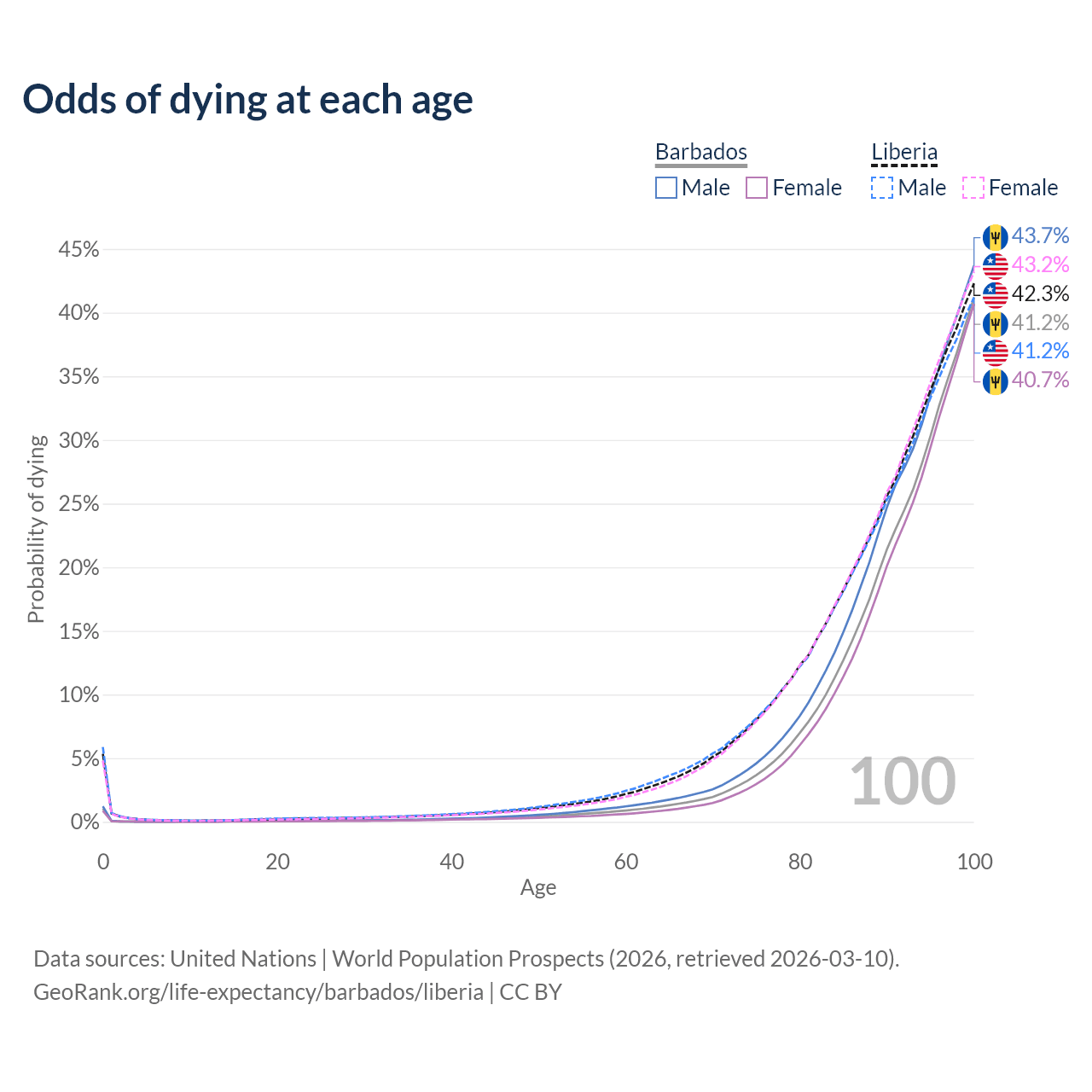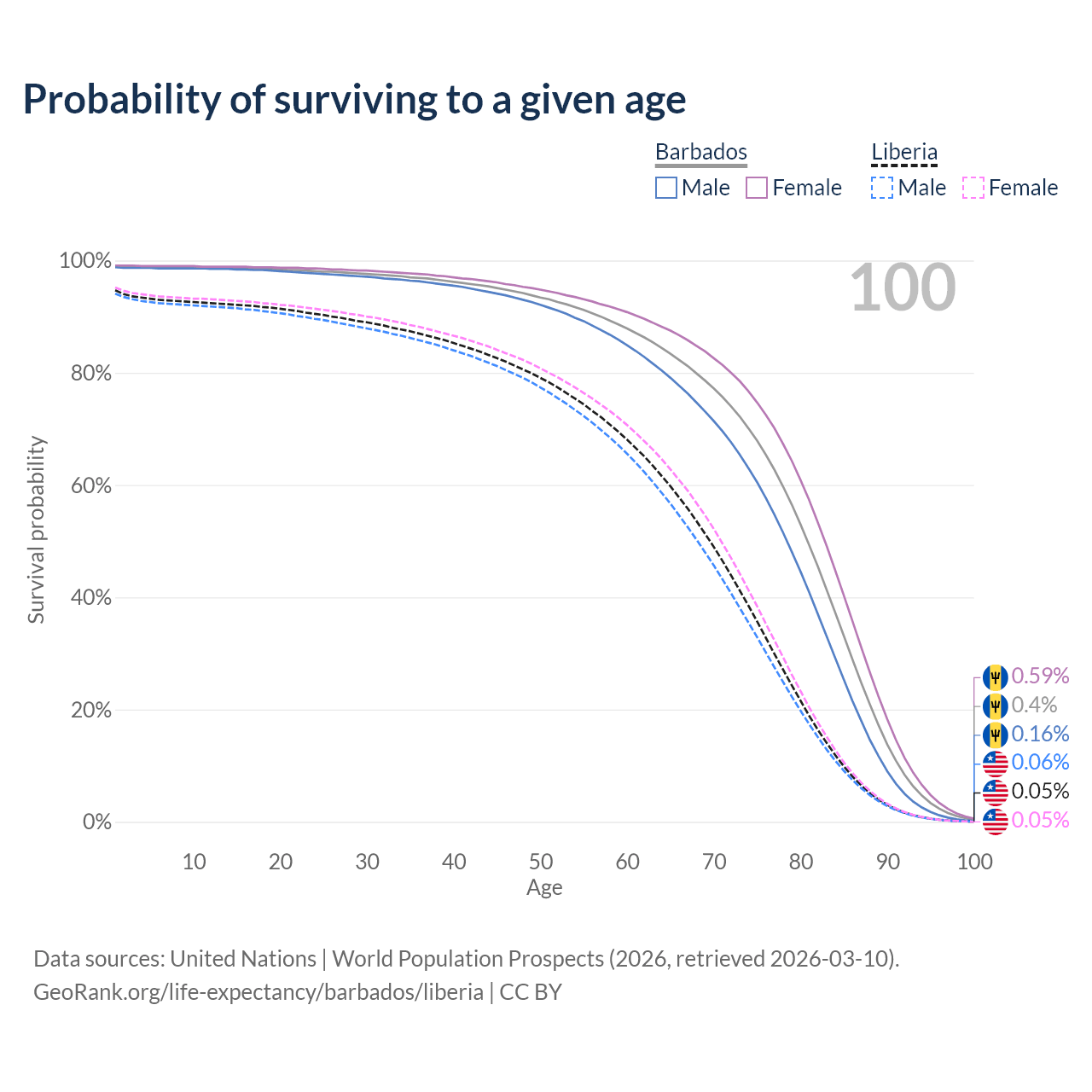 This life expectancy calculator shows the odds of living to 100, 95, 90, and below based on current age for both males and females in Barbados and Liberia, along with mean and median age of death. The calculations are based on the 2026 life tables (actuarial tables) from the UN World Population Prospects.