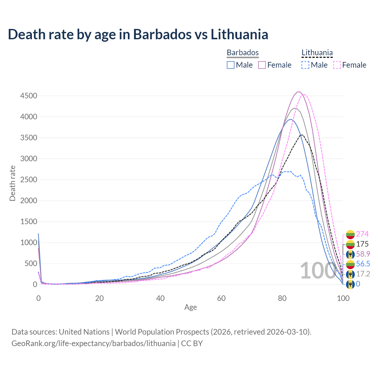 In Barbados, the most common age of death is 84, compared to 86 in Lithuania. The median age of death is 80.8 in Barbados and 80.4 in Lithuania, meaning only half of each cohort is expected to live past that age.