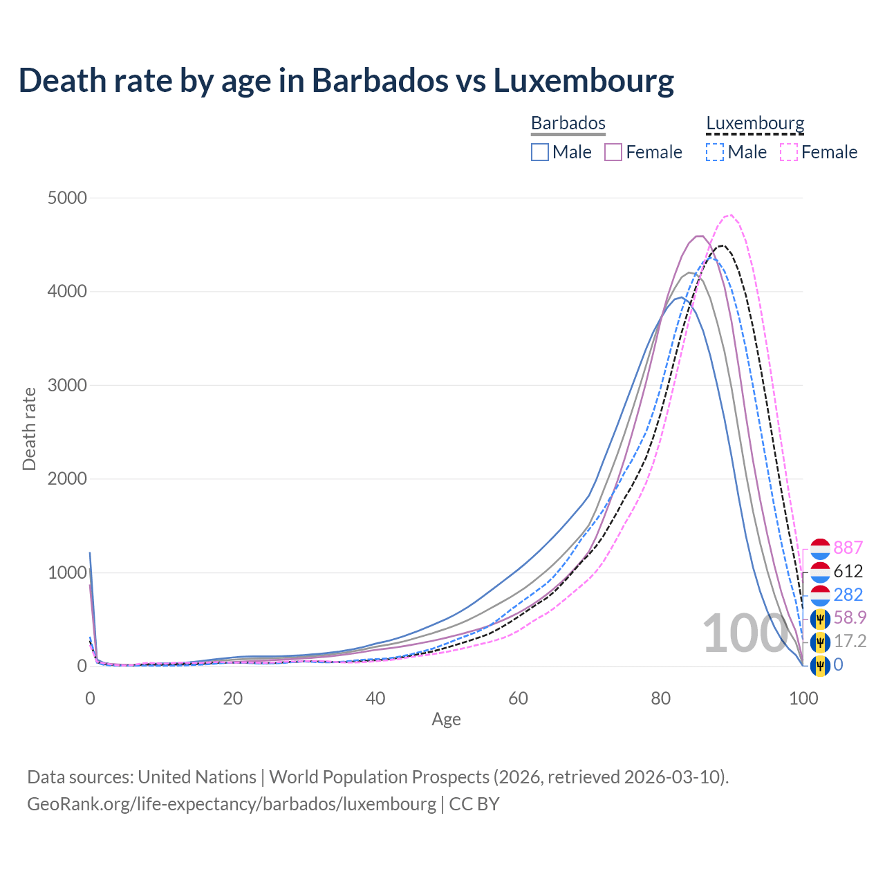 In Barbados, the most common age of death is 84, compared to 89 in Luxembourg. The median age of death is 80.8 in Barbados and 85.7 in Luxembourg, meaning only half of each cohort is expected to live past that age.