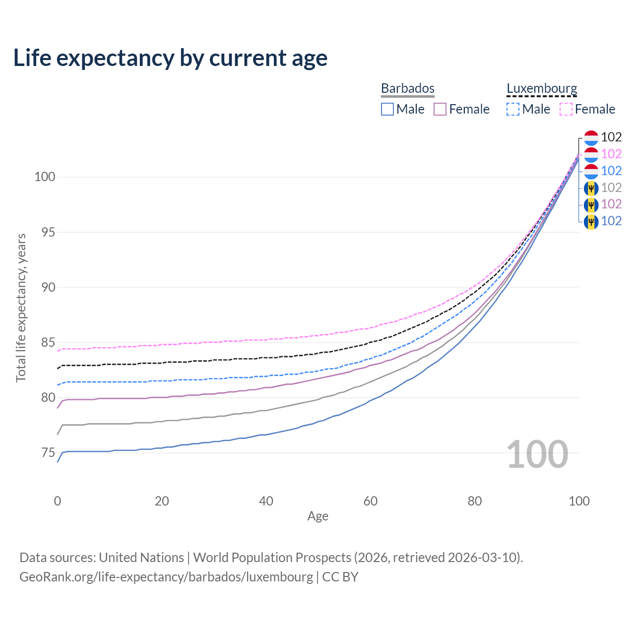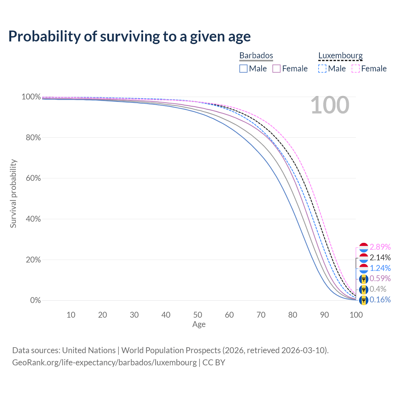 This life expectancy calculator shows the odds of living to 100, 95, 90, and below based on current age for both males and females in Barbados and Luxembourg, along with mean and median age of death. The calculations are based on the 2026 life tables (actuarial tables) from the UN World Population Prospects.