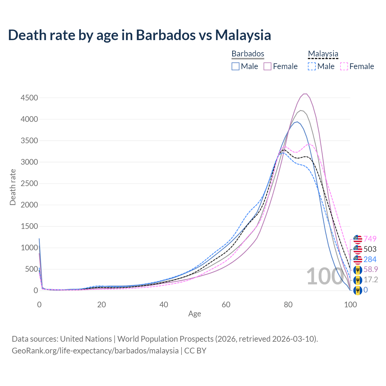 In Barbados, the most common age of death is 84, compared to 79 in Malaysia. The median age of death is 80.8 in Barbados and 79.8 in Malaysia, meaning only half of each cohort is expected to live past that age.