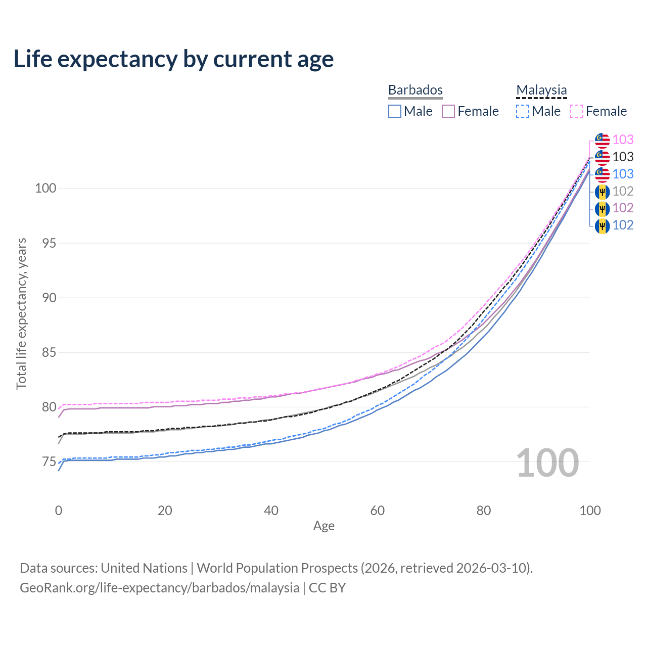 This life expectancy calculator shows the odds of living to 100, 95, 90, and below based on current age for both males and females in Barbados and Malaysia, along with mean and median age of death. The calculations are based on the 2026 life tables (actuarial tables) from the UN World Population Prospects.