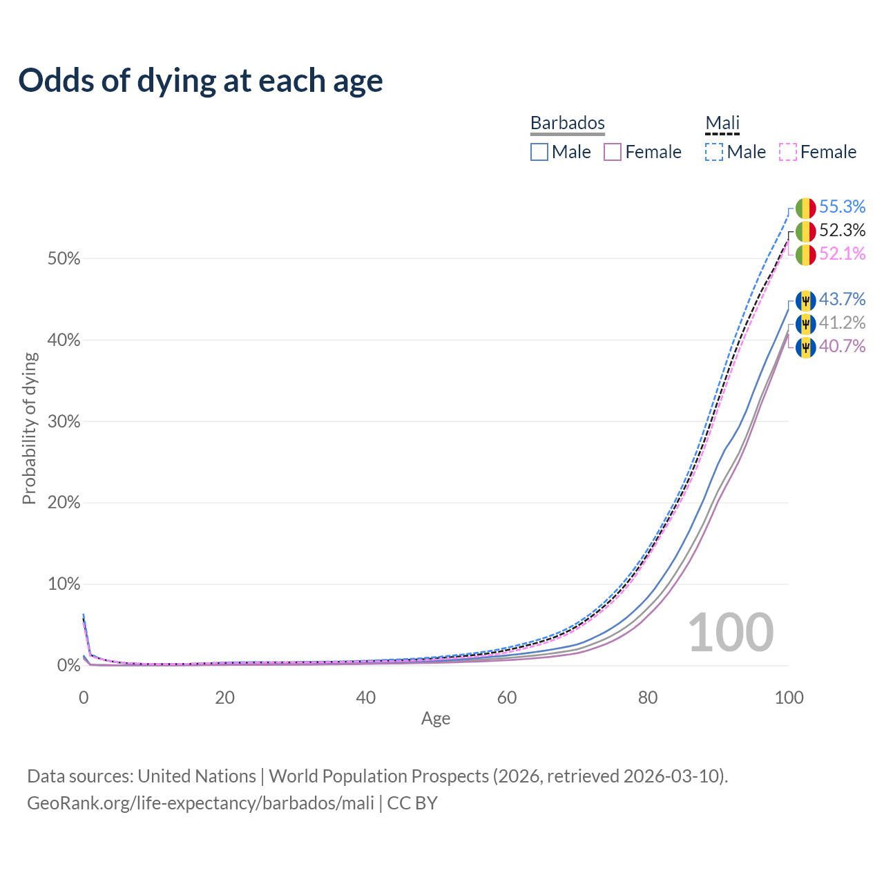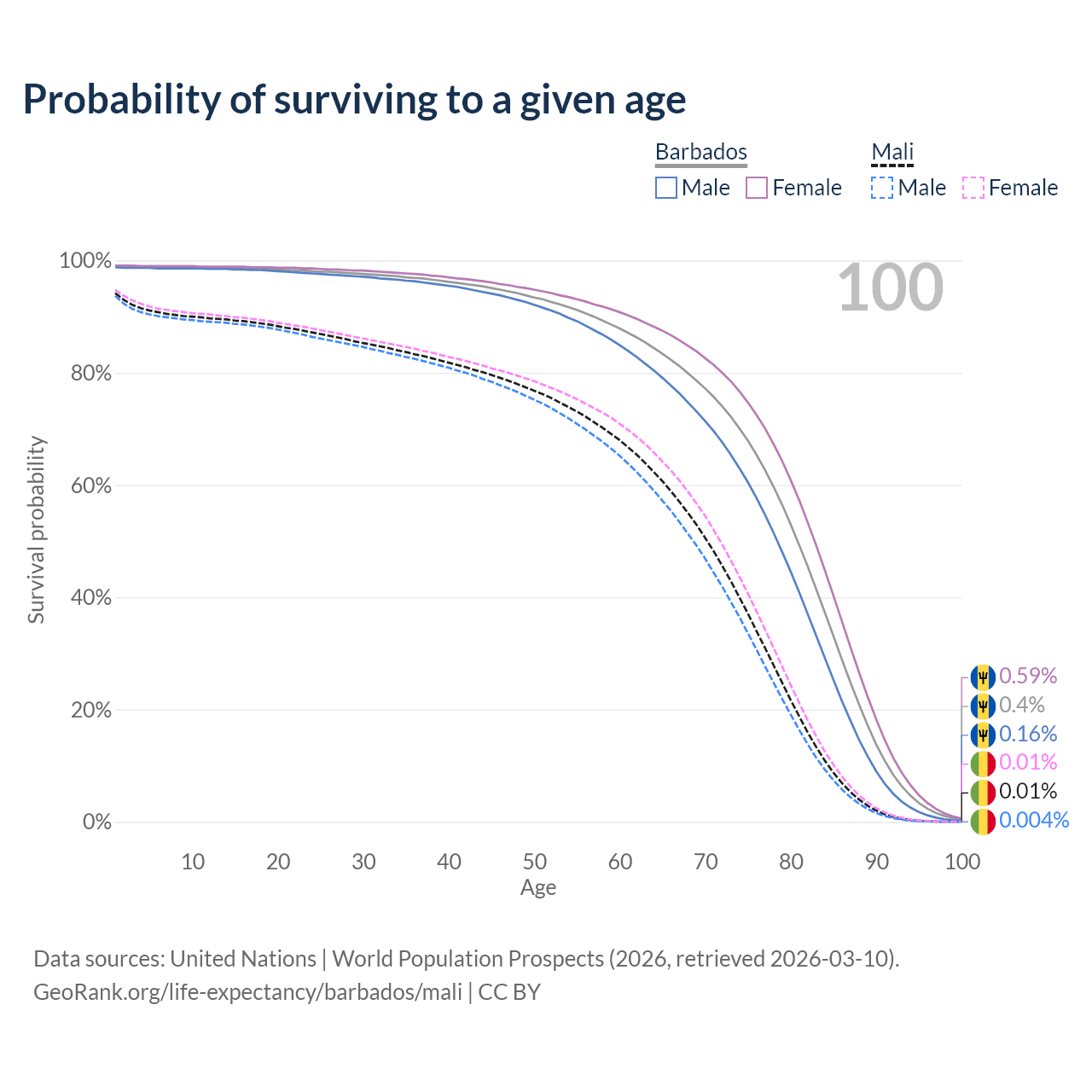 This life expectancy calculator shows the odds of living to 100, 95, 90, and below based on current age for both males and females in Barbados and Mali, along with mean and median age of death. The calculations are based on the 2026 life tables (actuarial tables) from the UN World Population Prospects.