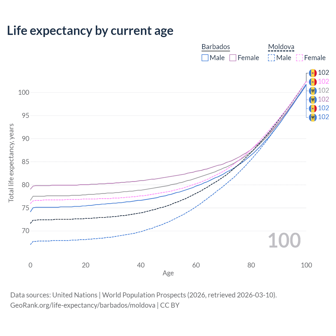 This life expectancy calculator shows the odds of living to 100, 95, 90, and below based on current age for both males and females in Barbados and Moldova, along with mean and median age of death. The calculations are based on the 2026 life tables (actuarial tables) from the UN World Population Prospects.