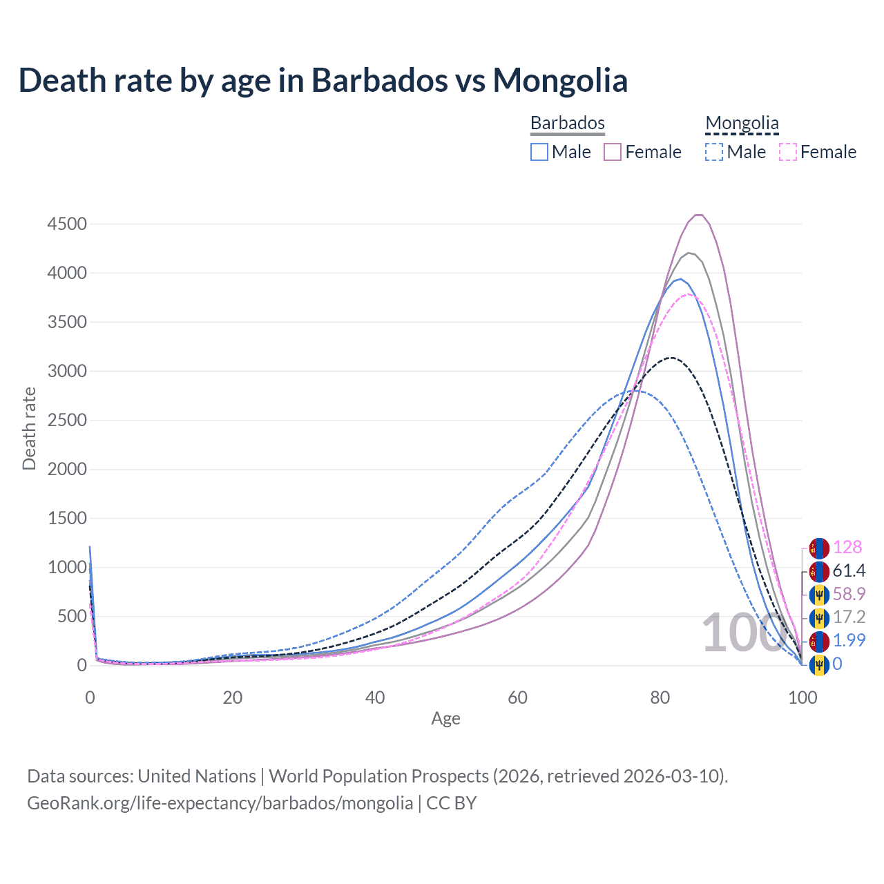 In Barbados, the most common age of death is 84, compared to 82 in Mongolia. The median age of death is 80.8 in Barbados and 76 in Mongolia, meaning only half of each cohort is expected to live past that age.
