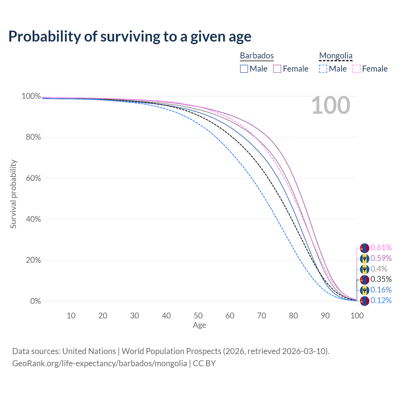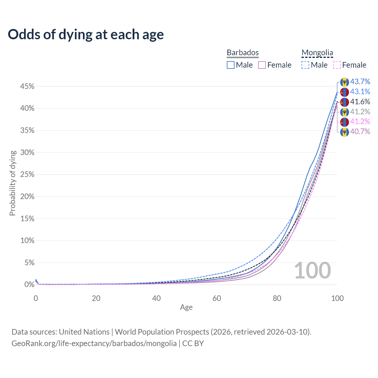 This life expectancy calculator shows the odds of living to 100, 95, 90, and below based on current age for both males and females in Barbados and Mongolia, along with mean and median age of death. The calculations are based on the 2026 life tables (actuarial tables) from the UN World Population Prospects.