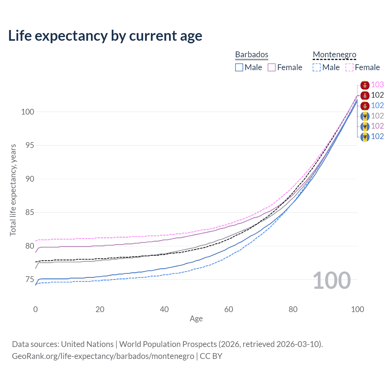 This life expectancy calculator shows the odds of living to 100, 95, 90, and below based on current age for both males and females in Barbados and Montenegro, along with mean and median age of death. The calculations are based on the 2026 life tables (actuarial tables) from the UN World Population Prospects.