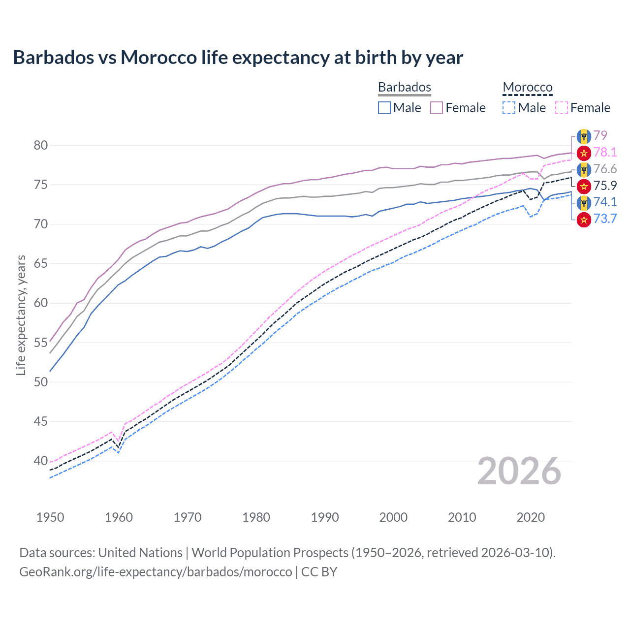 The average life expectancy at birth is 76.6 years in Barbados vs 75.9 in Morocco. Barbados is ranked 77/197 by life expectancy, and Morocco is 85/197. In Barbados, the life expectancy is 74.1 years for males and 79 years for females. In Morocco, it's 73.7 years for males and 78.1 years for females.