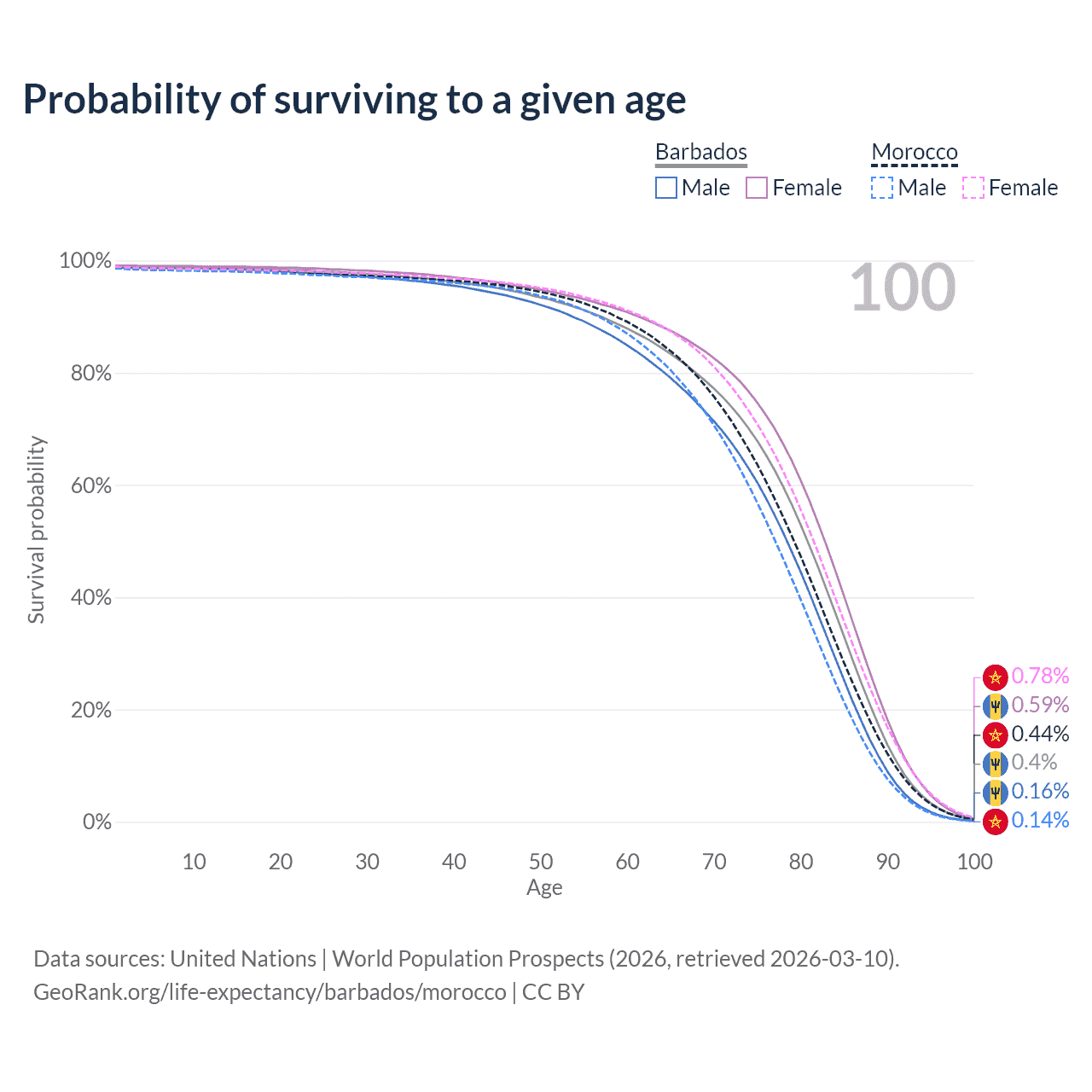 This life expectancy calculator shows the odds of living to 100, 95, 90, and below based on current age for both males and females in Barbados and Morocco, along with mean and median age of death. The calculations are based on the 2026 life tables (actuarial tables) from the UN World Population Prospects.