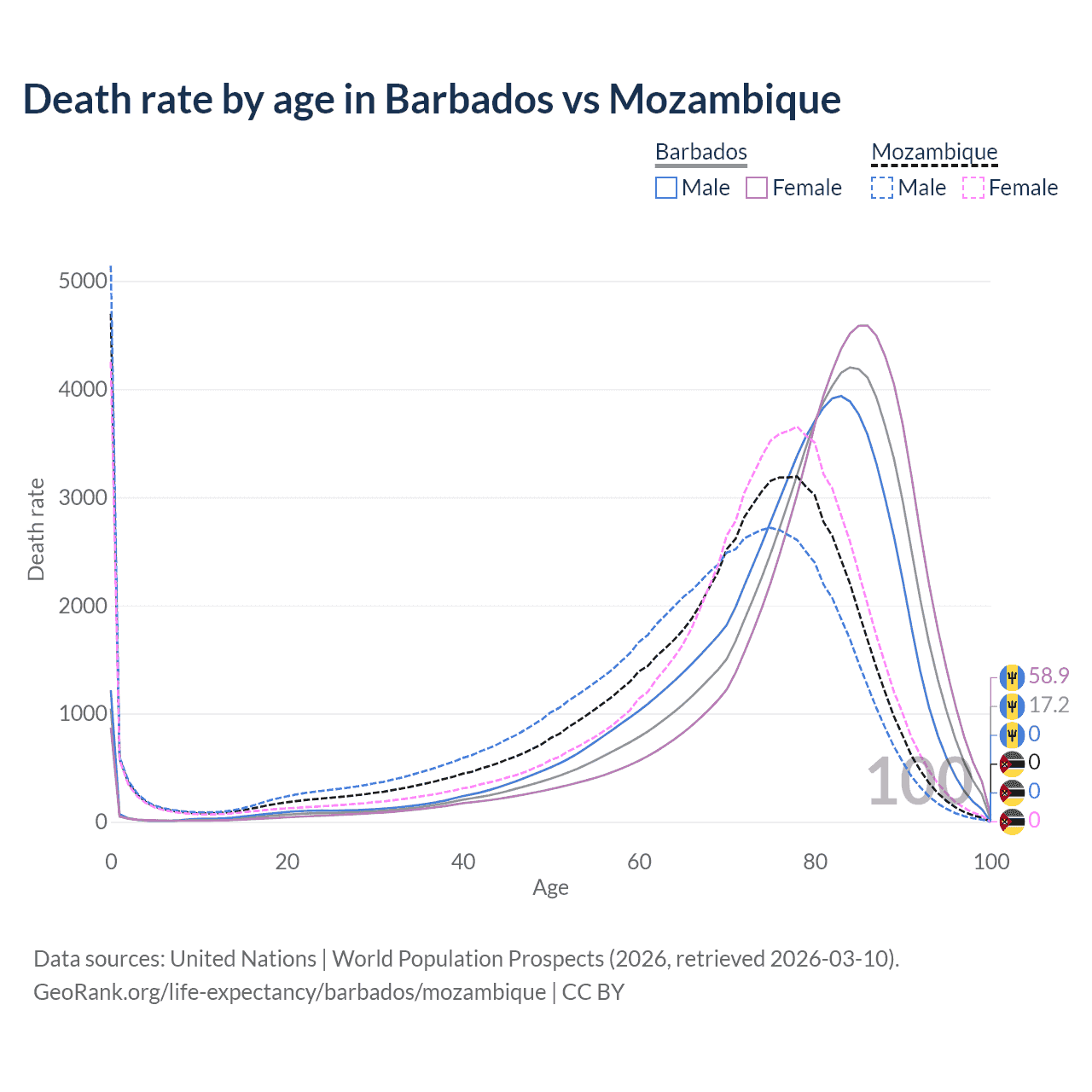 In Barbados, the most common age of death is 84, compared to 0 in Mozambique. The median age of death is 80.8 in Barbados and 71.2 in Mozambique, meaning only half of each cohort is expected to live past that age.