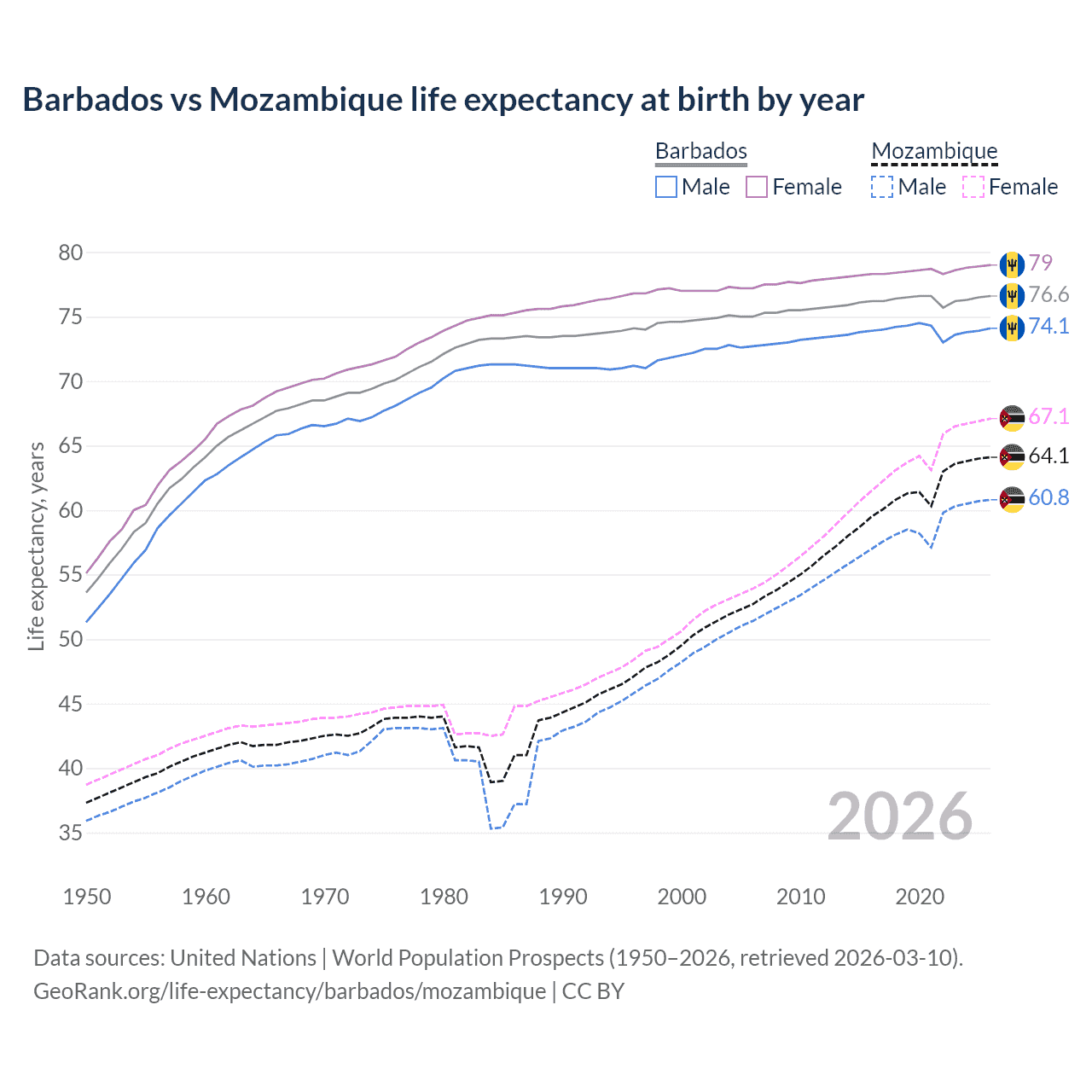 The average life expectancy at birth is 76.6 years in Barbados vs 64.1 in Mozambique. Barbados is ranked 77/197 by life expectancy, and Mozambique is 178/197. In Barbados, the life expectancy is 74.1 years for males and 79 years for females. In Mozambique, it's 60.8 years for males and 67.1 years for females.