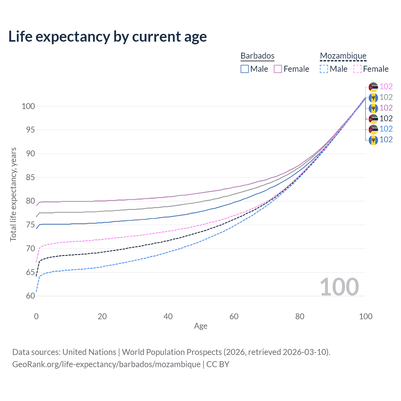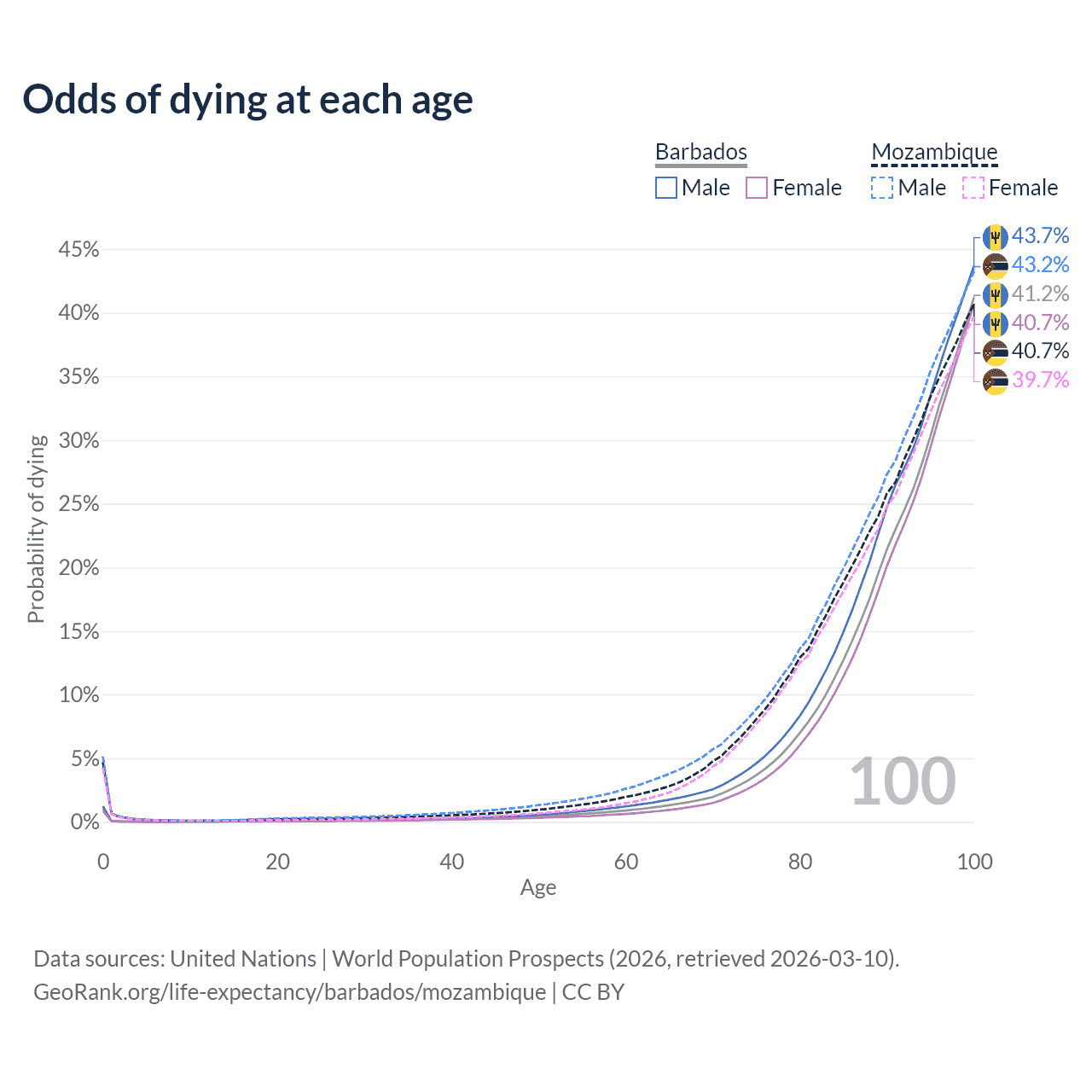 This life expectancy calculator shows the odds of living to 100, 95, 90, and below based on current age for both males and females in Barbados and Mozambique, along with mean and median age of death. The calculations are based on the 2026 life tables (actuarial tables) from the UN World Population Prospects.
