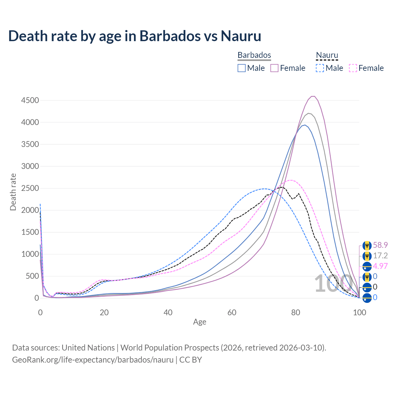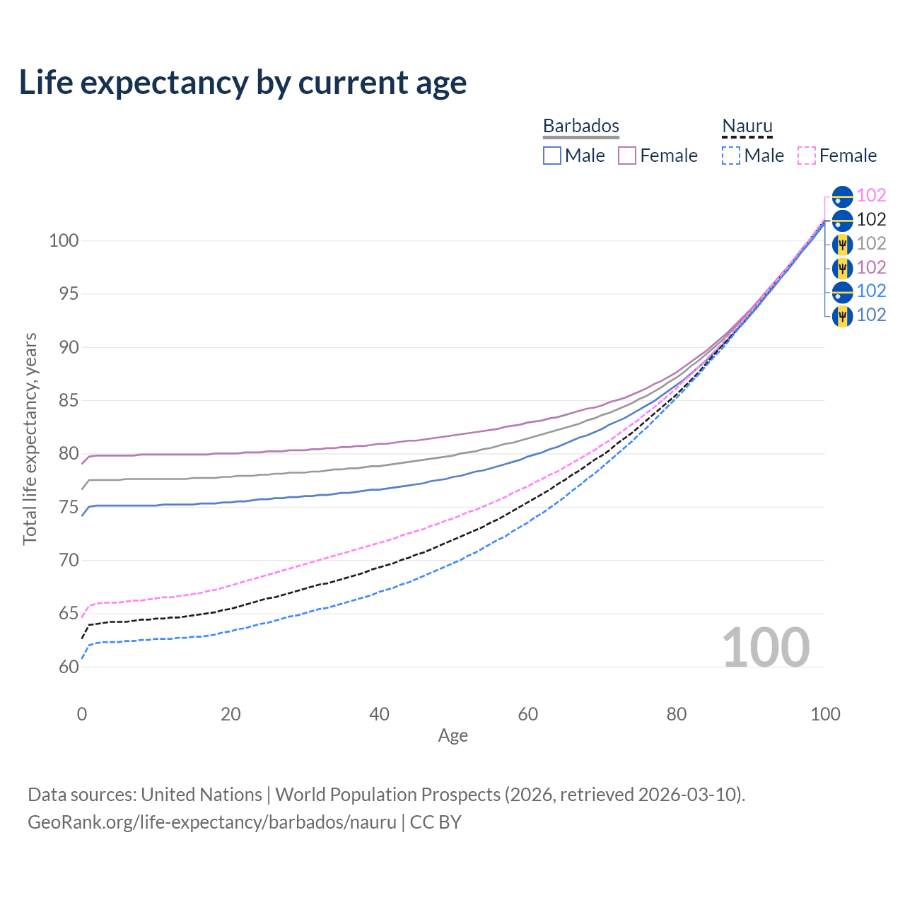 This life expectancy calculator shows the odds of living to 100, 95, 90, and below based on current age for both males and females in Barbados and Nauru, along with mean and median age of death. The calculations are based on the 2026 life tables (actuarial tables) from the UN World Population Prospects.