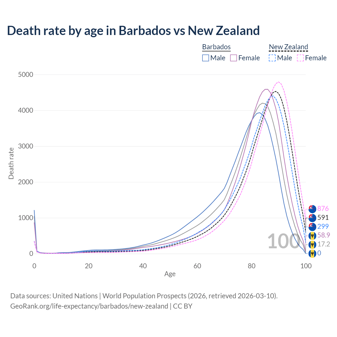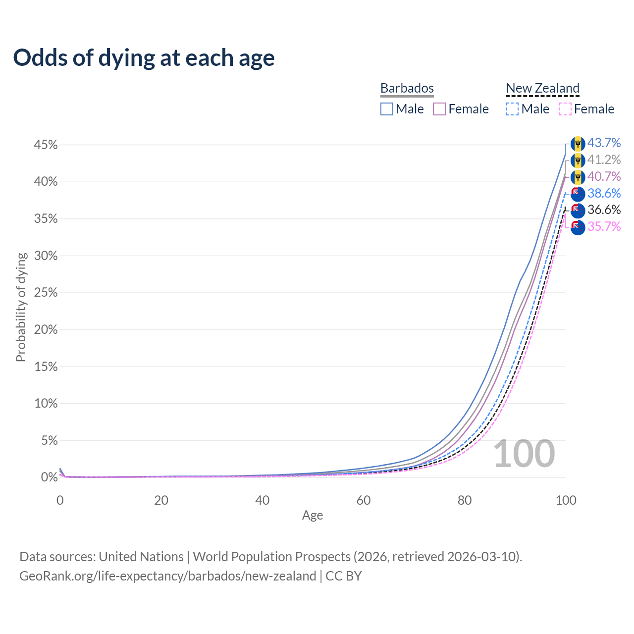This life expectancy calculator shows the odds of living to 100, 95, 90, and below based on current age for both males and females in Barbados and New Zealand, along with mean and median age of death. The calculations are based on the 2026 life tables (actuarial tables) from the UN World Population Prospects.