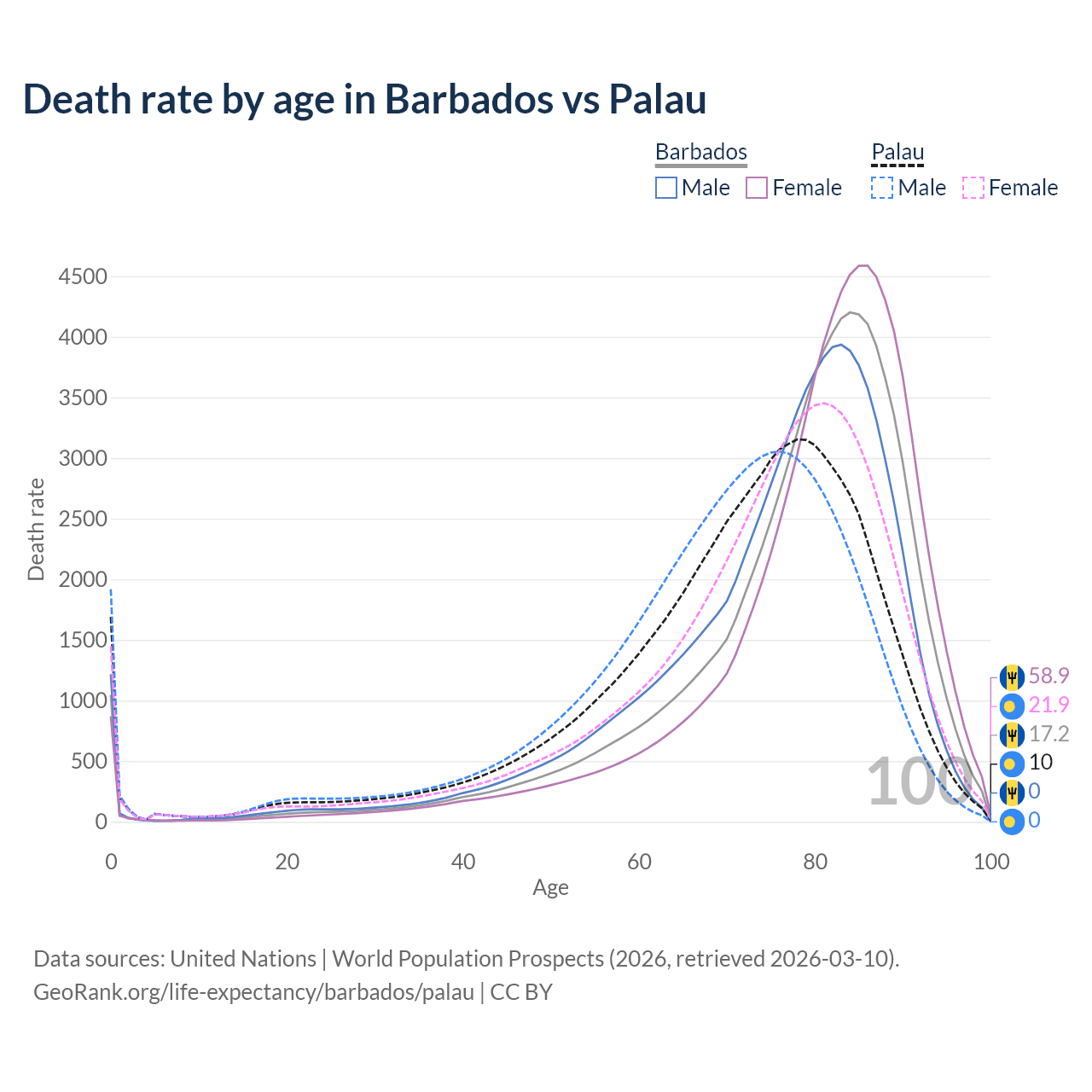 This life expectancy calculator shows the odds of living to 100, 95, 90, and below based on current age for both males and females in Barbados and Palau, along with mean and median age of death. The calculations are based on the 2026 life tables (actuarial tables) from the UN World Population Prospects.