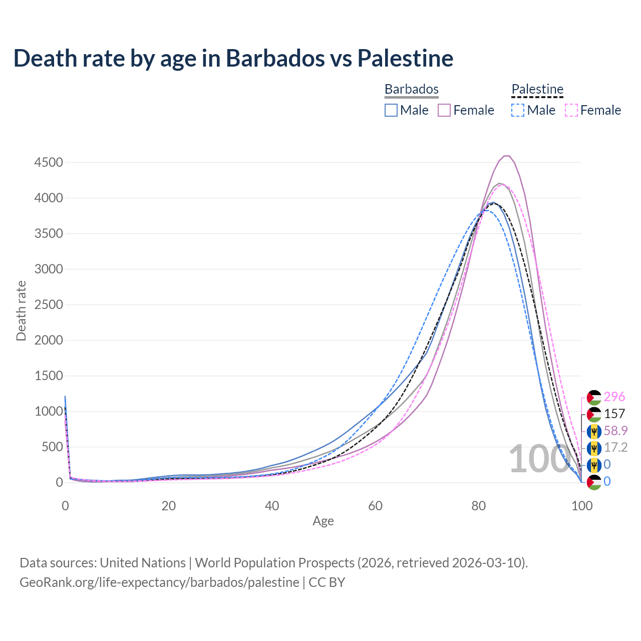 This life expectancy calculator shows the odds of living to 100, 95, 90, and below based on current age for both males and females in Barbados and Palestine, along with mean and median age of death. The calculations are based on the 2026 life tables (actuarial tables) from the UN World Population Prospects.