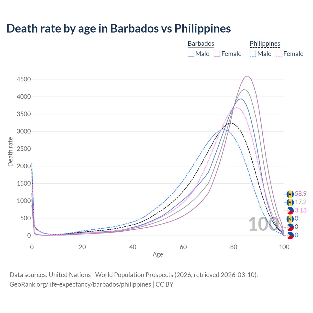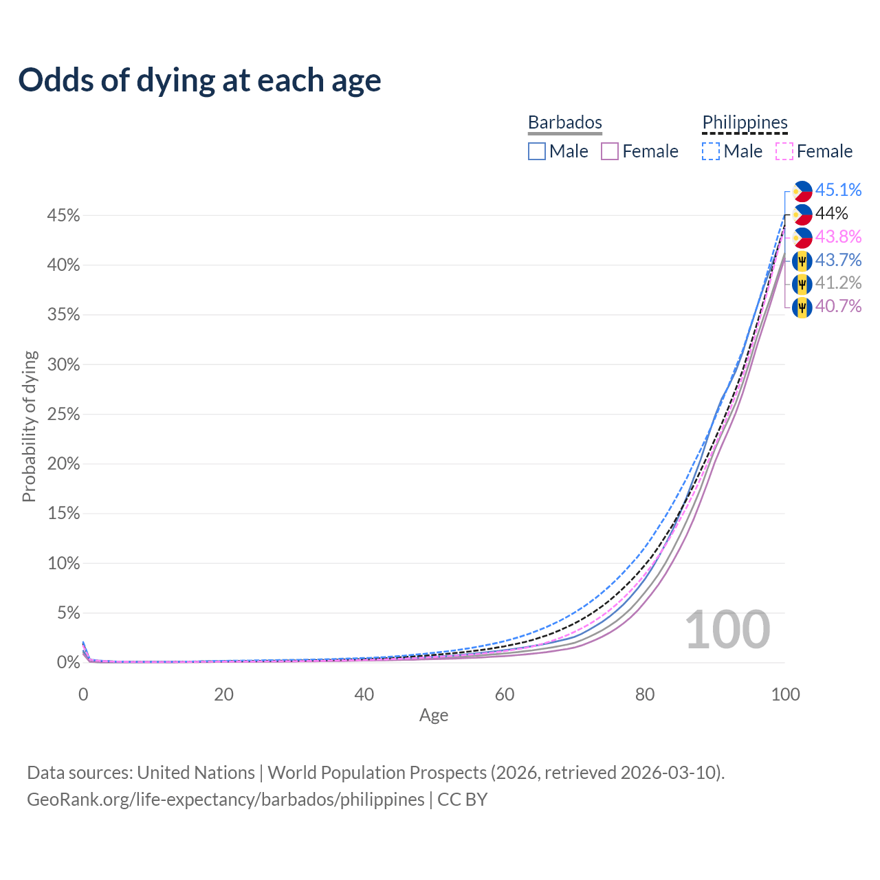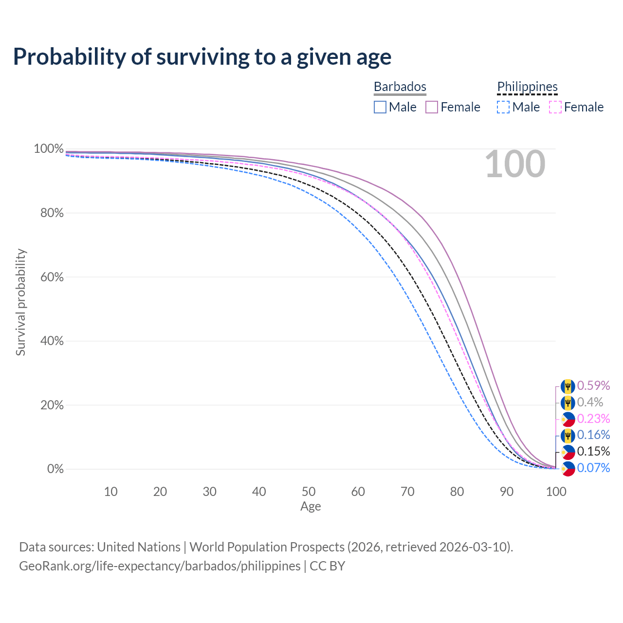 This life expectancy calculator shows the odds of living to 100, 95, 90, and below based on current age for both males and females in Barbados and the Philippines, along with mean and median age of death. The calculations are based on the 2026 life tables (actuarial tables) from the UN World Population Prospects.