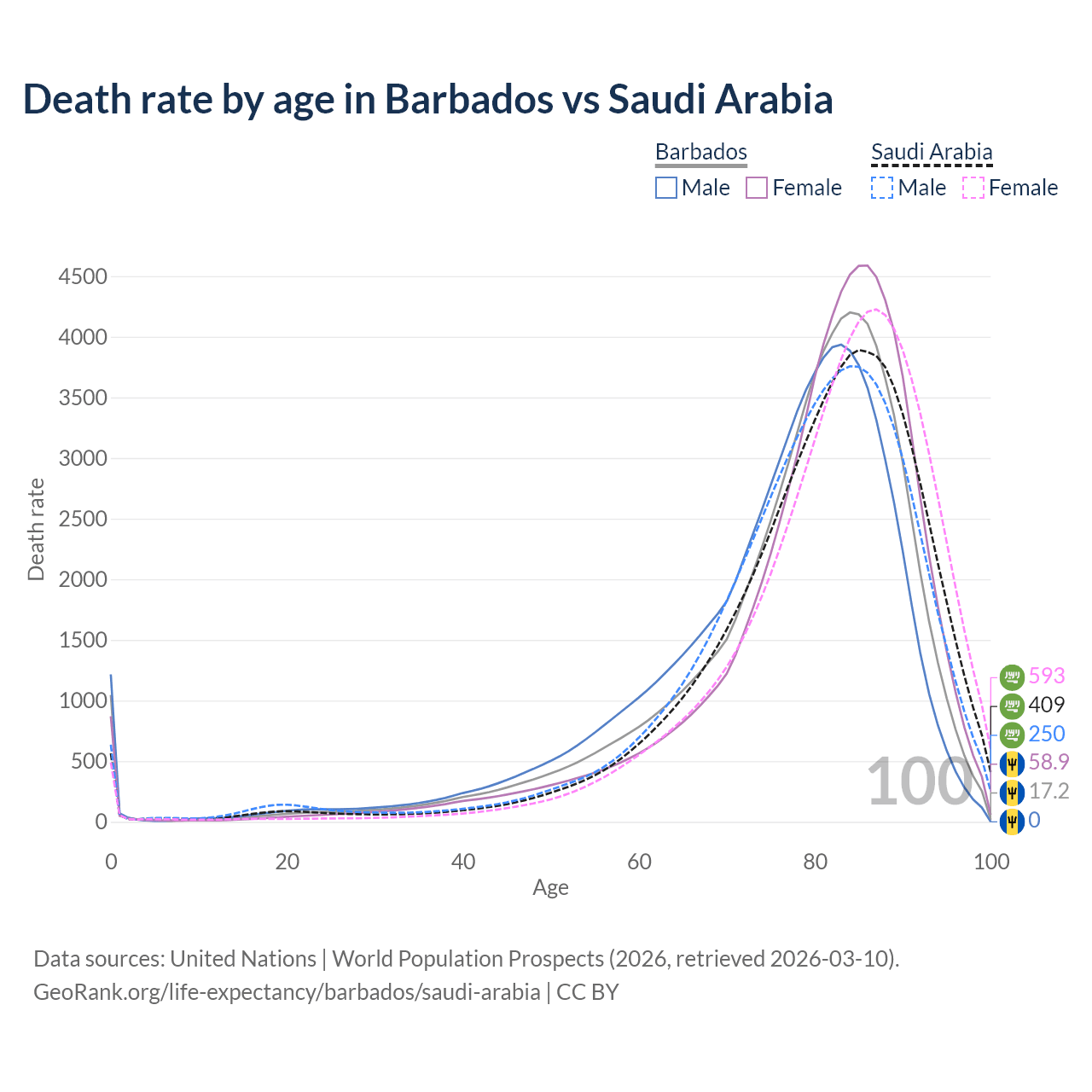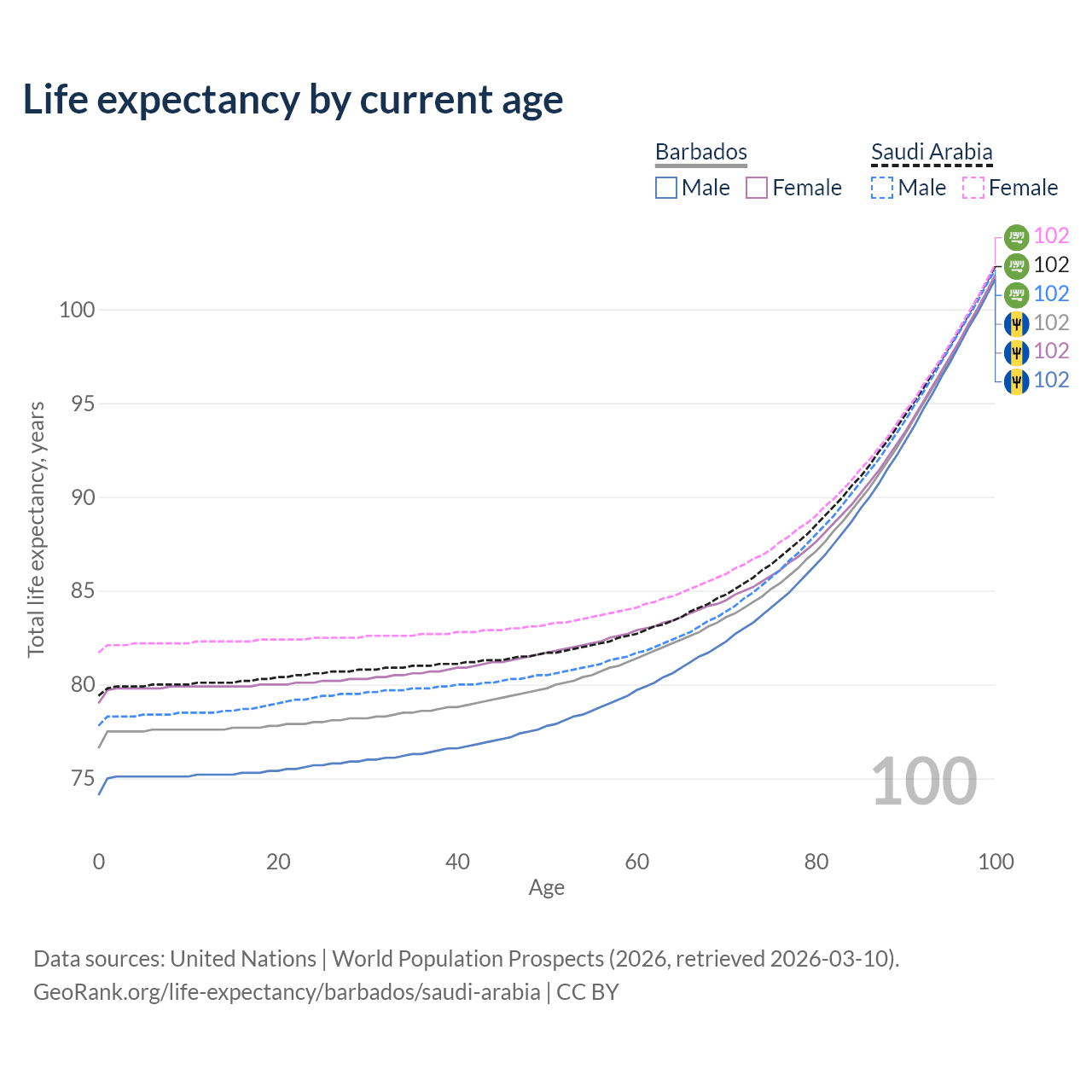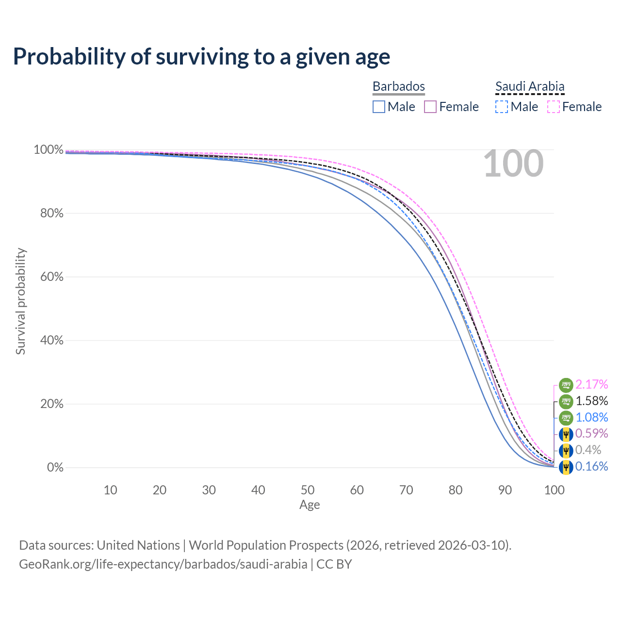 This life expectancy calculator shows the odds of living to 100, 95, 90, and below based on current age for both males and females in Barbados and Saudi Arabia, along with mean and median age of death. The calculations are based on the 2026 life tables (actuarial tables) from the UN World Population Prospects.