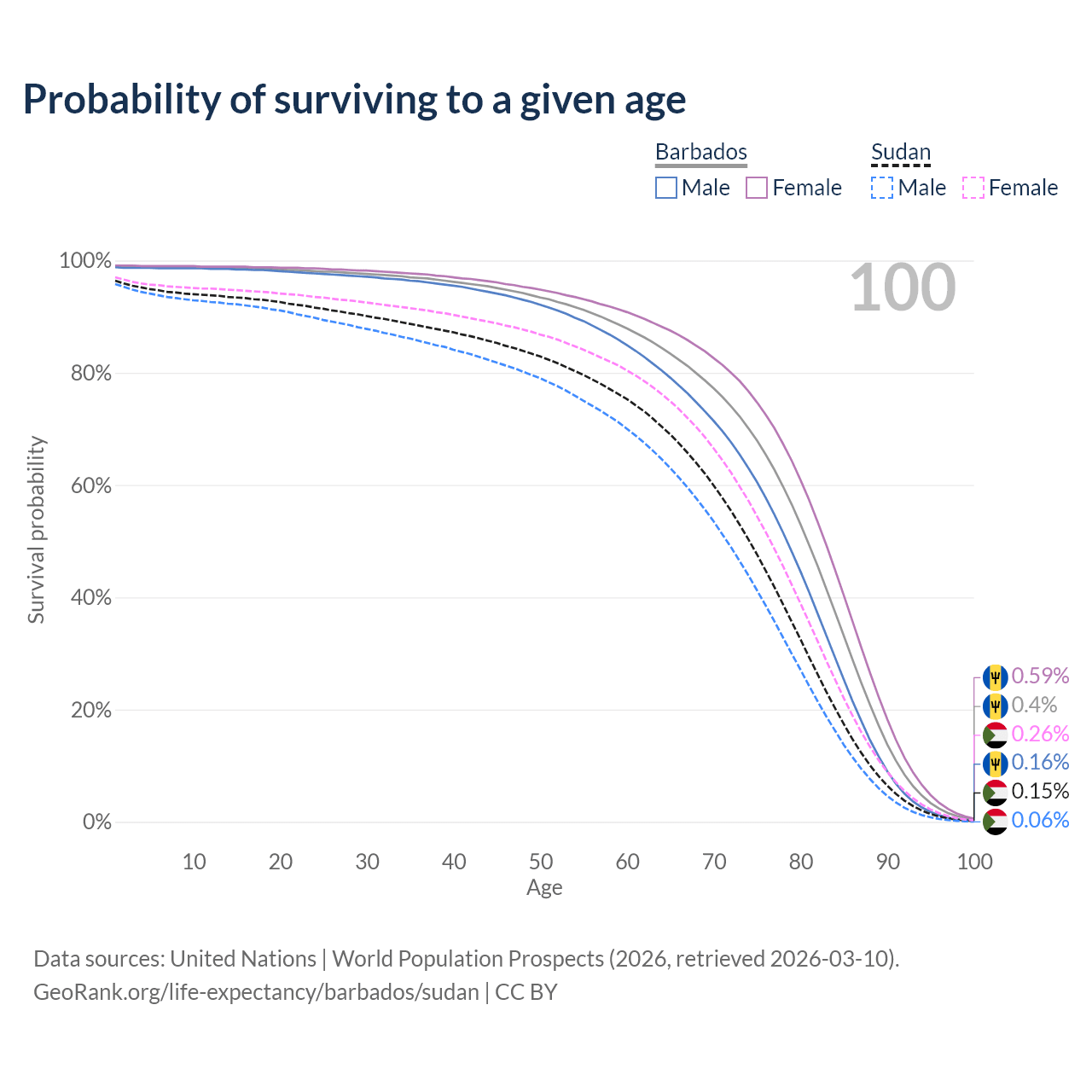This life expectancy calculator shows the odds of living to 100, 95, 90, and below based on current age for both males and females in Barbados and Sudan, along with mean and median age of death. The calculations are based on the 2026 life tables (actuarial tables) from the UN World Population Prospects.