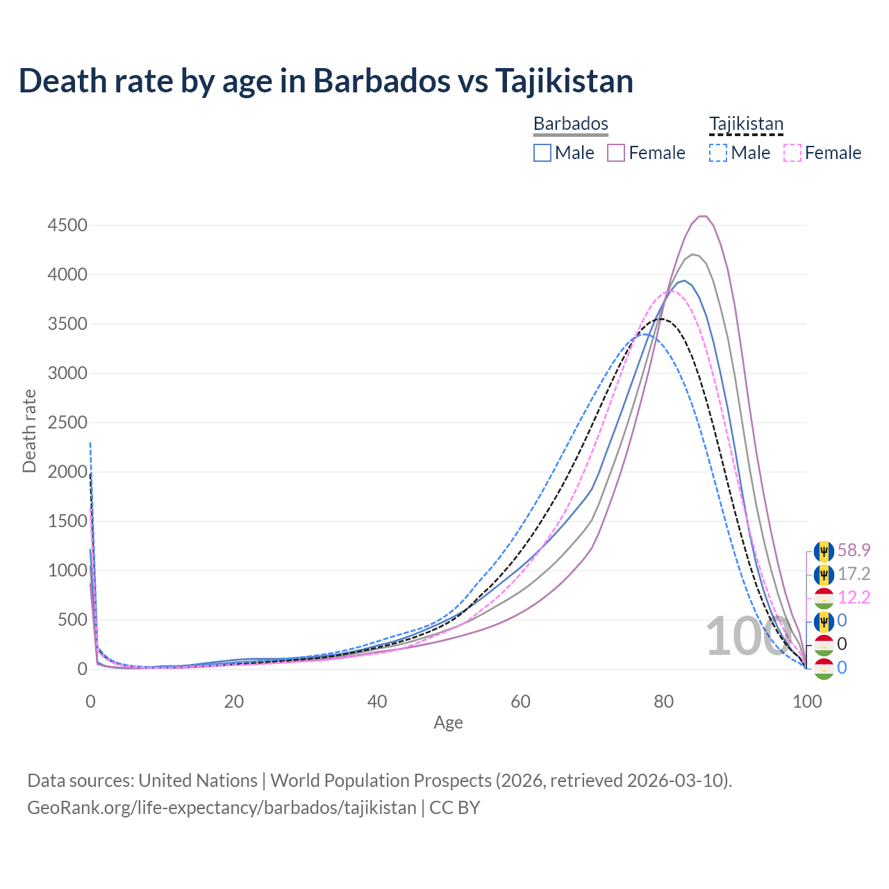 In Barbados, the most common age of death is 84, compared to 80 in Tajikistan. The median age of death is 80.8 in Barbados and 76 in Tajikistan, meaning only half of each cohort is expected to live past that age.