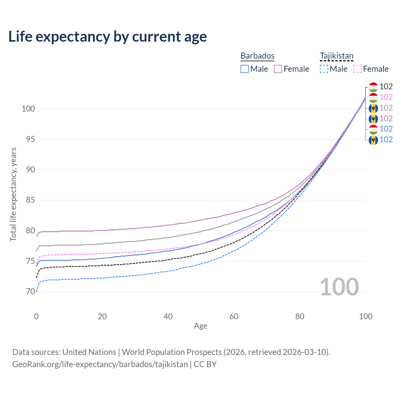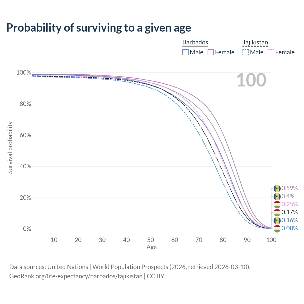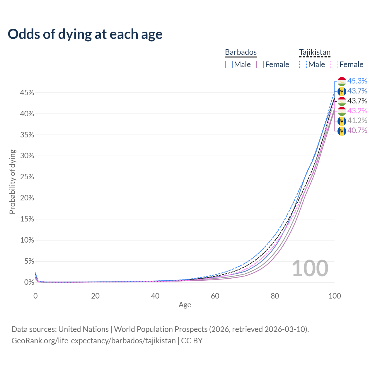 This life expectancy calculator shows the odds of living to 100, 95, 90, and below based on current age for both males and females in Barbados and Tajikistan, along with mean and median age of death. The calculations are based on the 2026 life tables (actuarial tables) from the UN World Population Prospects.