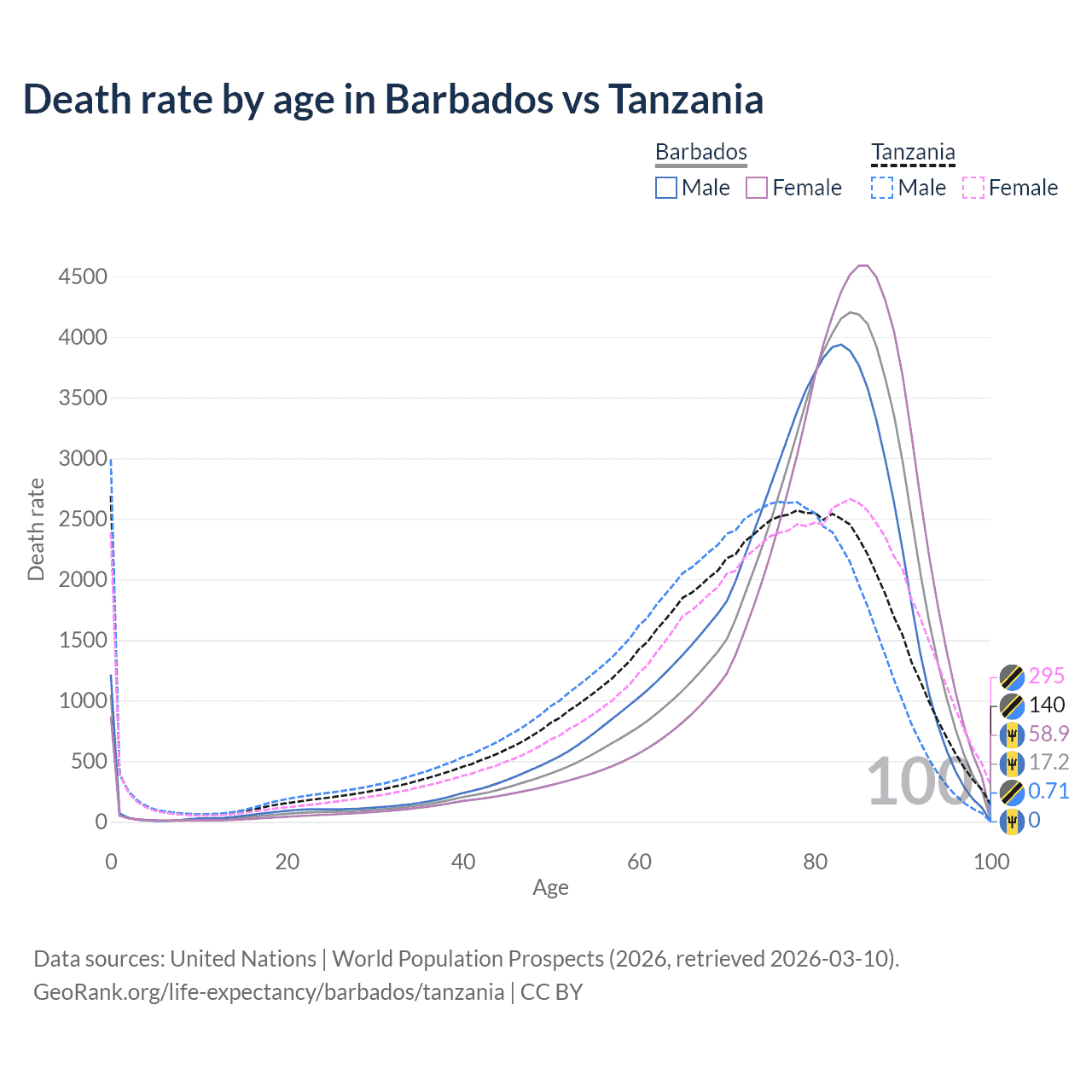 In Barbados, the most common age of death is 84, compared to 0 in Tanzania. The median age of death is 80.8 in Barbados and 72.6 in Tanzania, meaning only half of each cohort is expected to live past that age.