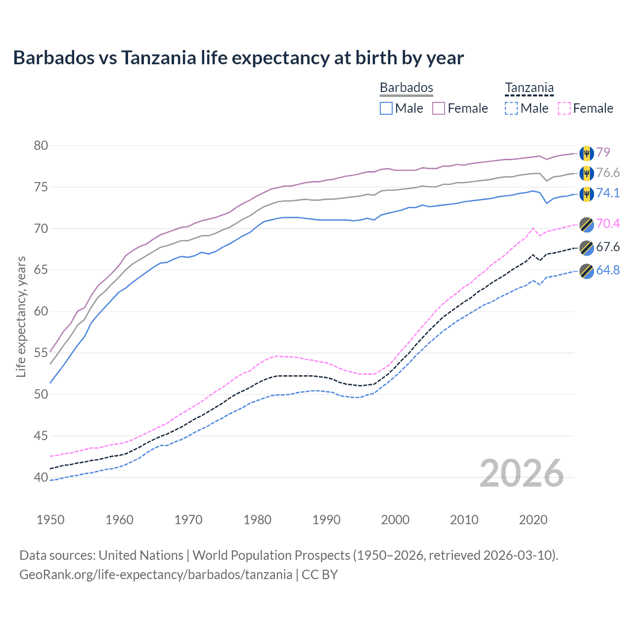 The average life expectancy at birth is 76.6 years in Barbados vs 67.6 in Tanzania. Barbados is ranked 77/197 by life expectancy, and Tanzania is 155/197. In Barbados, the life expectancy is 74.1 years for males and 79 years for females. In Tanzania, it's 64.8 years for males and 70.4 years for females.