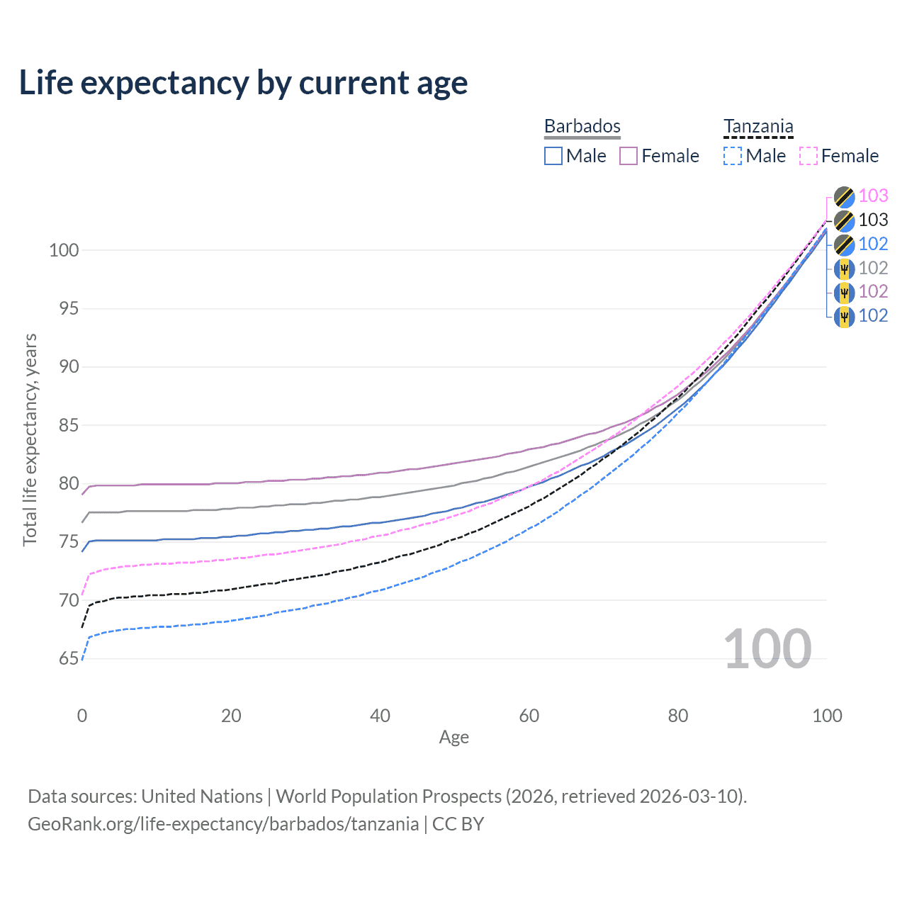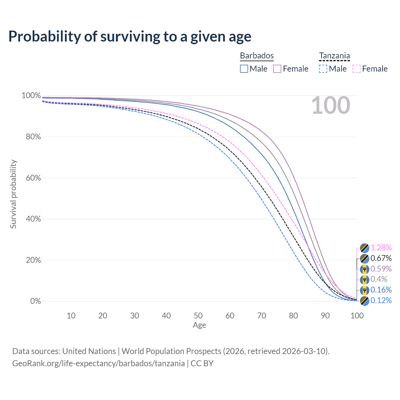 This life expectancy calculator shows the odds of living to 100, 95, 90, and below based on current age for both males and females in Barbados and Tanzania, along with mean and median age of death. The calculations are based on the 2026 life tables (actuarial tables) from the UN World Population Prospects.