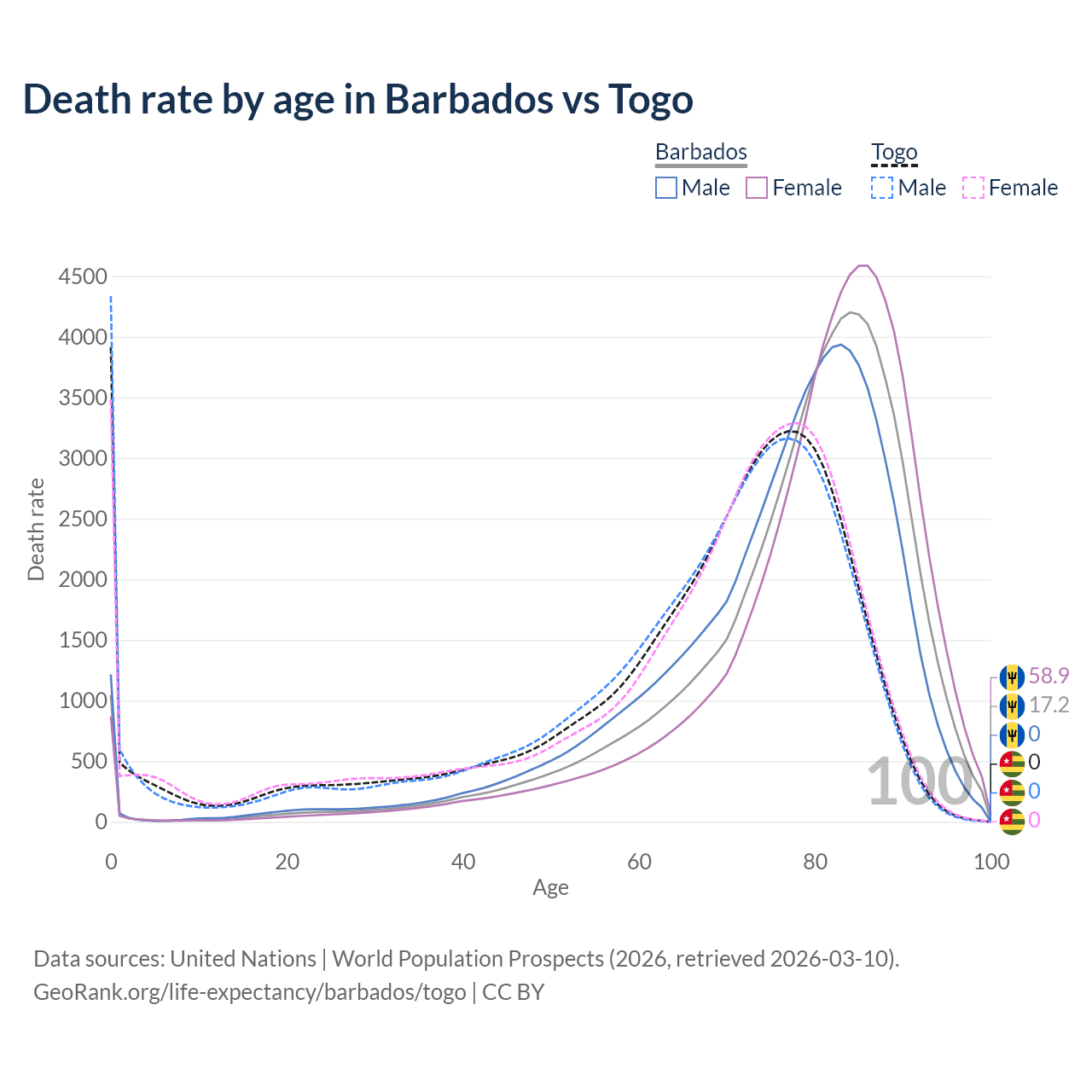 In Barbados, the most common age of death is 84, compared to 0 in Togo. The median age of death is 80.8 in Barbados and 71 in Togo, meaning only half of each cohort is expected to live past that age.