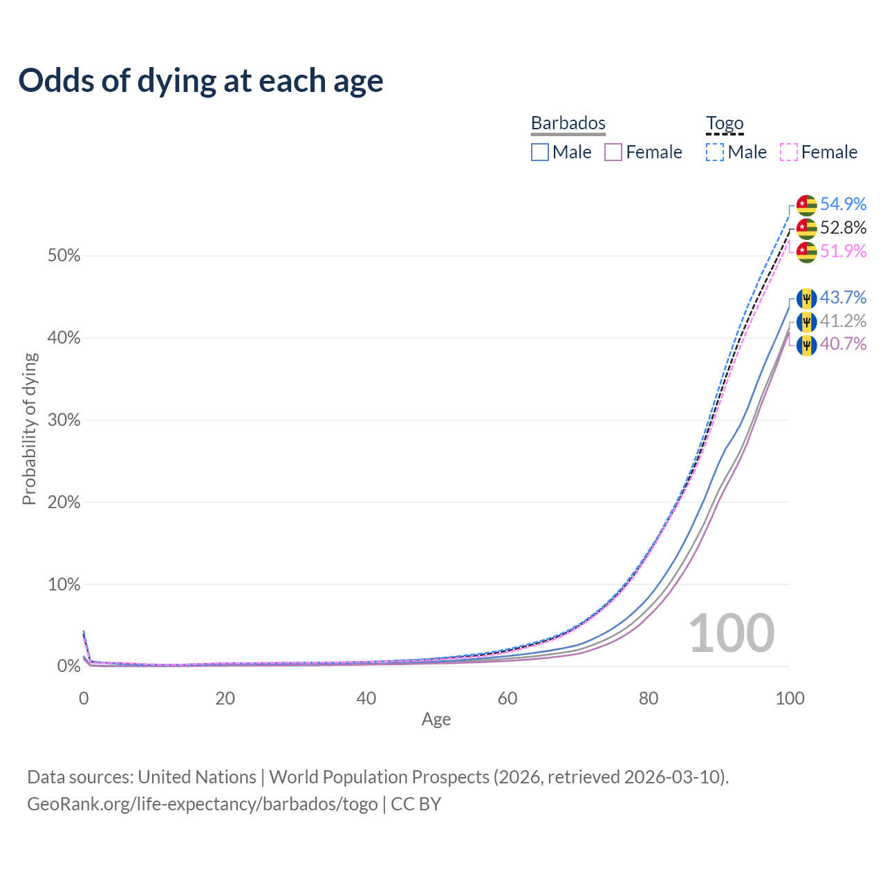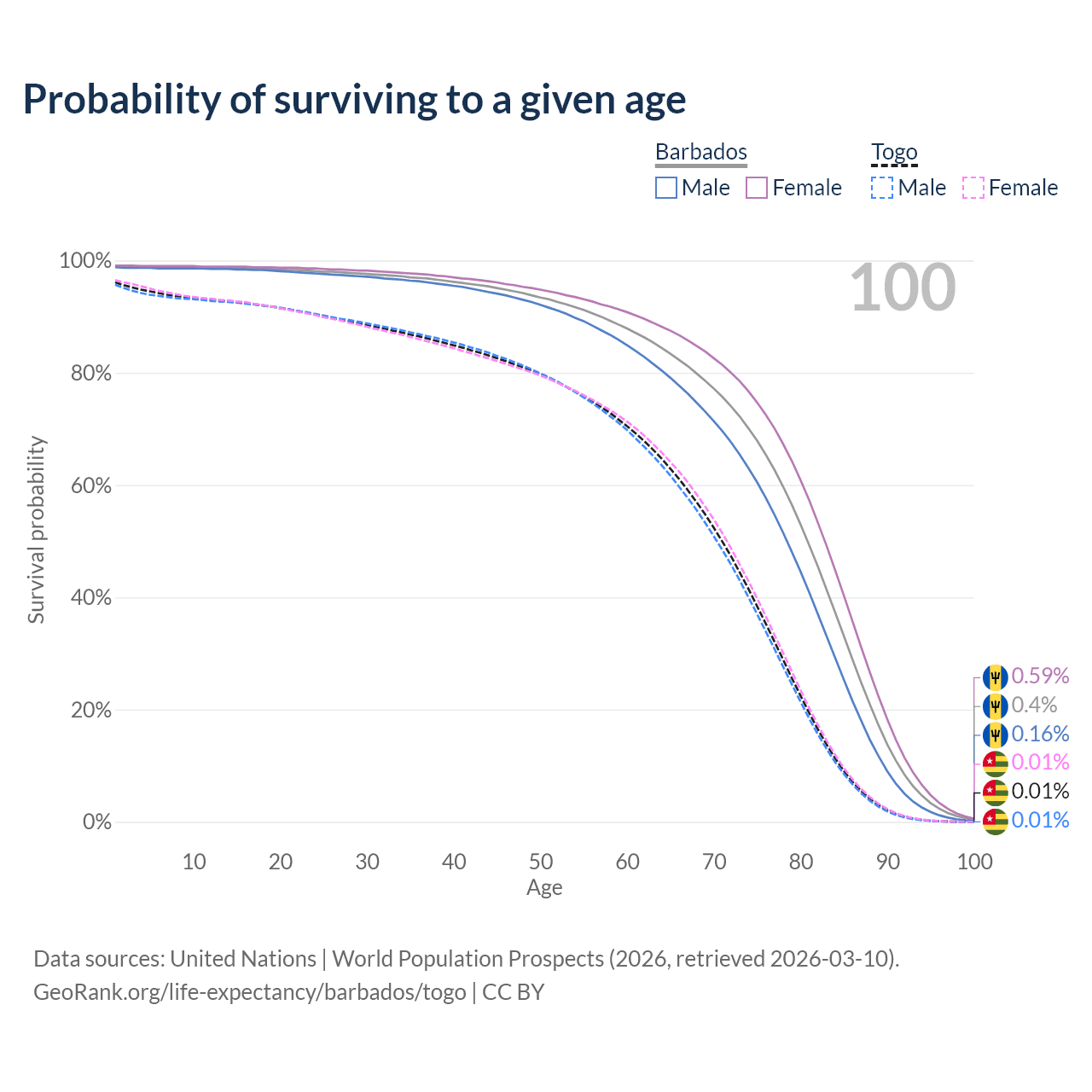 This life expectancy calculator shows the odds of living to 100, 95, 90, and below based on current age for both males and females in Barbados and Togo, along with mean and median age of death. The calculations are based on the 2026 life tables (actuarial tables) from the UN World Population Prospects.