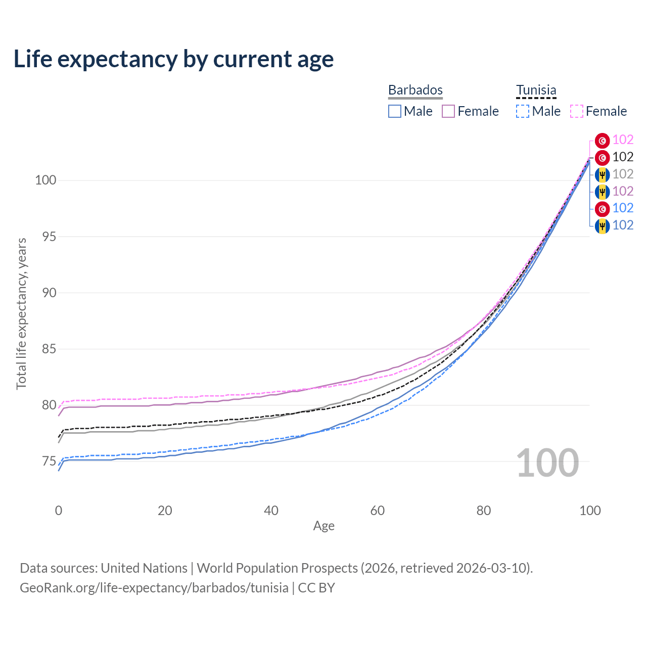 This life expectancy calculator shows the odds of living to 100, 95, 90, and below based on current age for both males and females in Barbados and Tunisia, along with mean and median age of death. The calculations are based on the 2026 life tables (actuarial tables) from the UN World Population Prospects.
