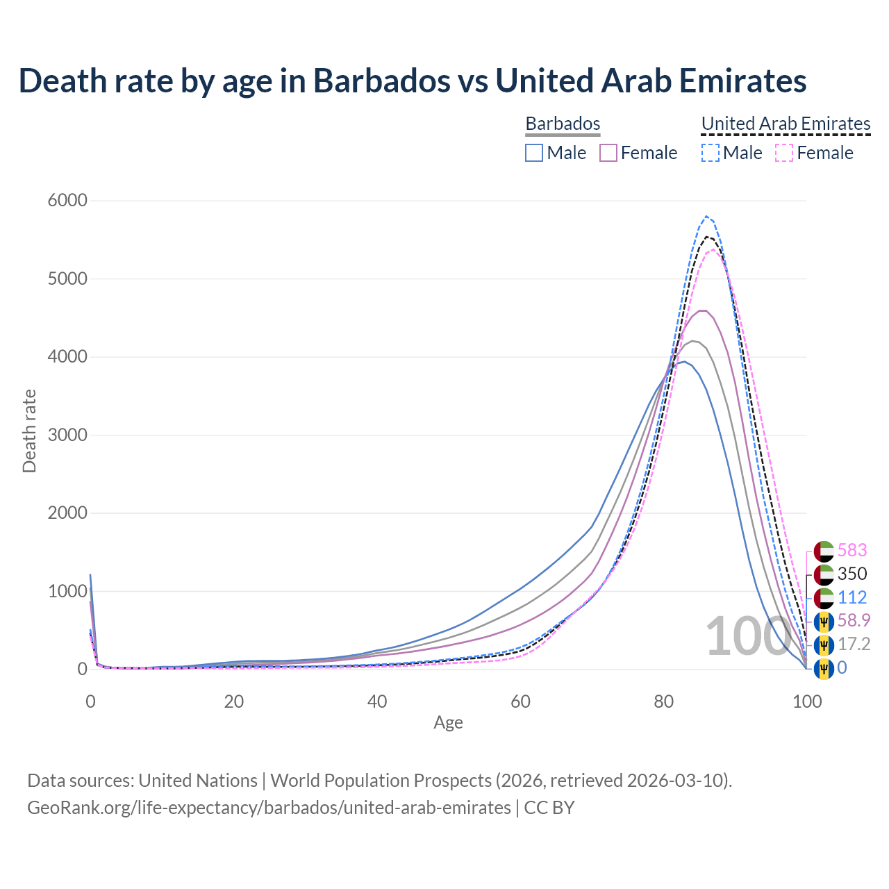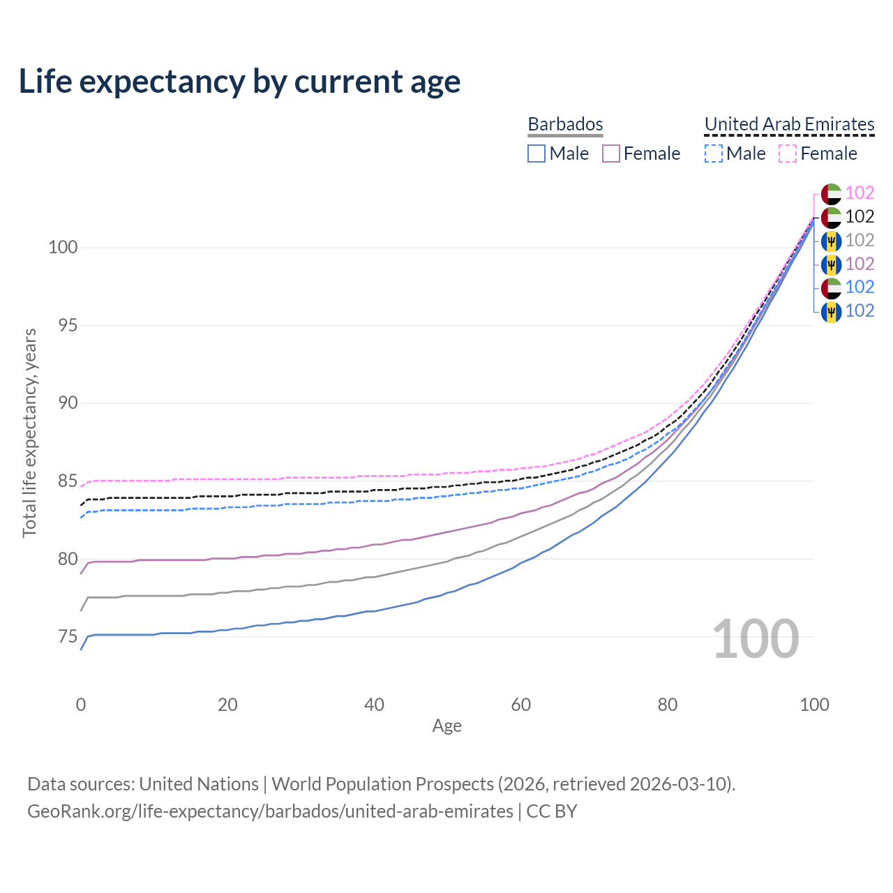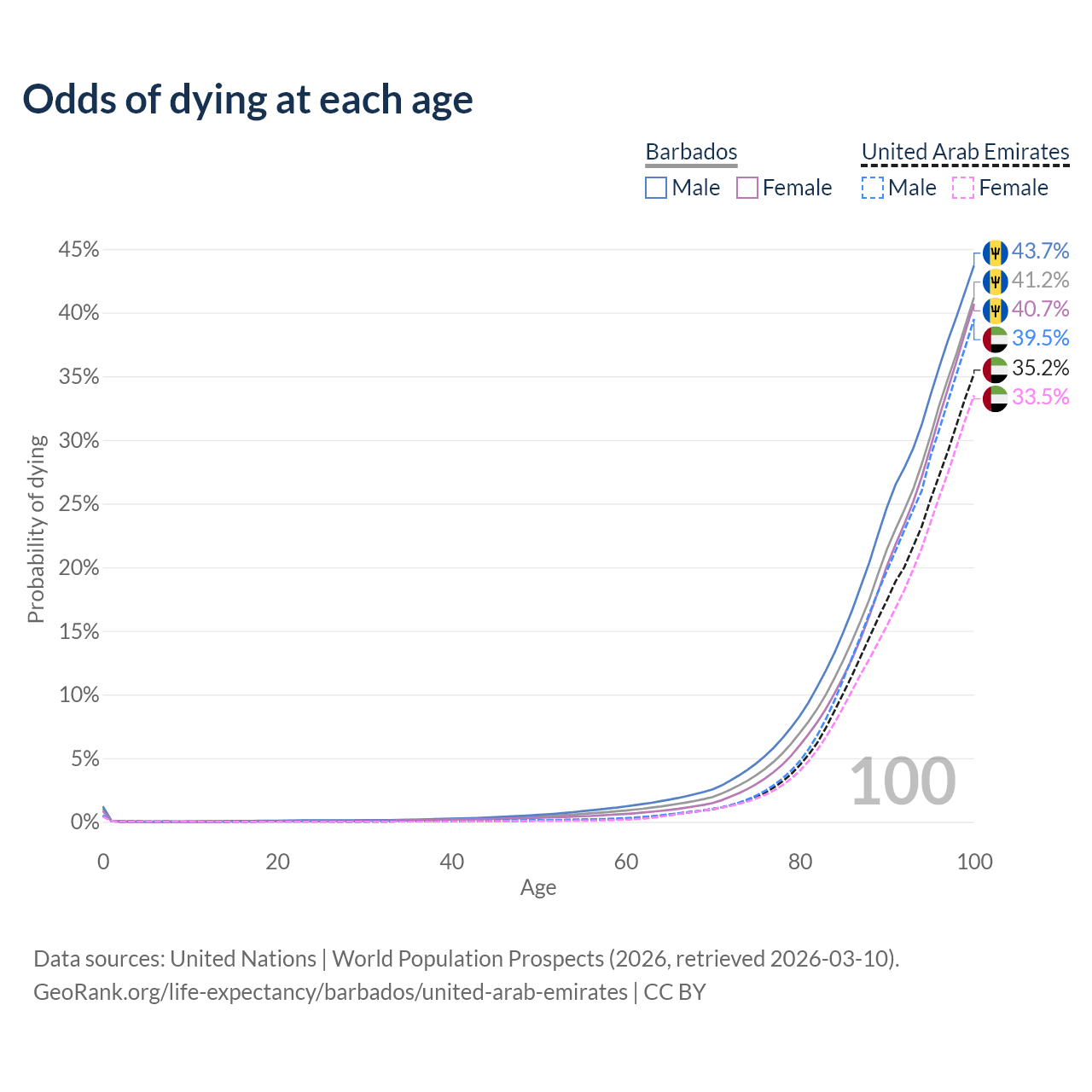 This life expectancy calculator shows the odds of living to 100, 95, 90, and below based on current age for both males and females in Barbados and the United Arab Emirates, along with mean and median age of death. The calculations are based on the 2026 life tables (actuarial tables) from the UN World Population Prospects.