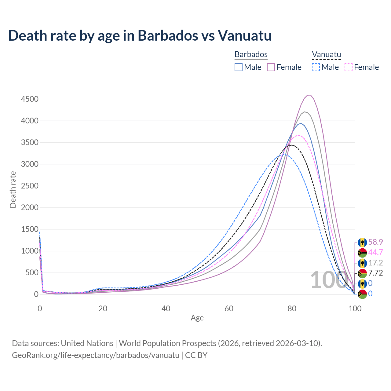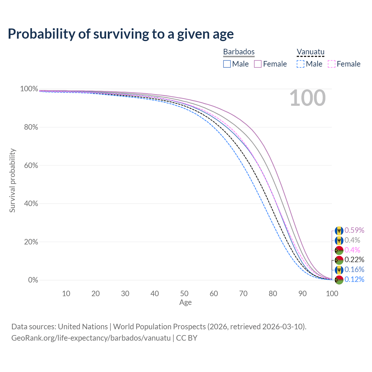 This life expectancy calculator shows the odds of living to 100, 95, 90, and below based on current age for both males and females in Barbados and Vanuatu, along with mean and median age of death. The calculations are based on the 2026 life tables (actuarial tables) from the UN World Population Prospects.