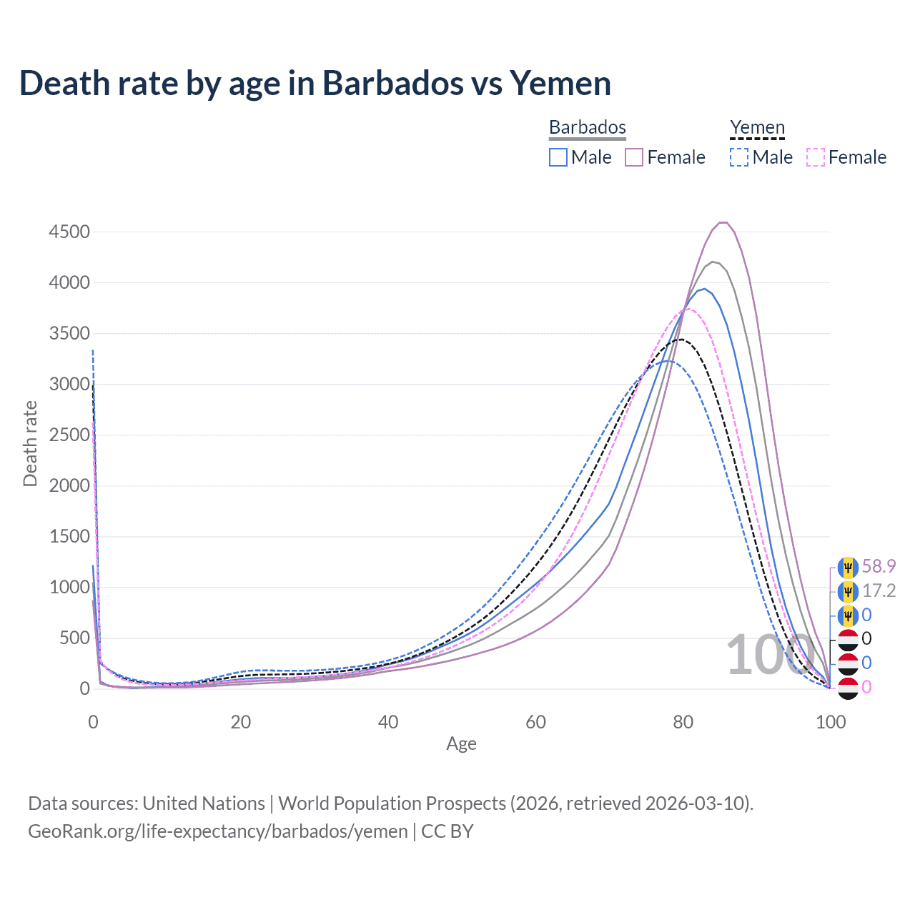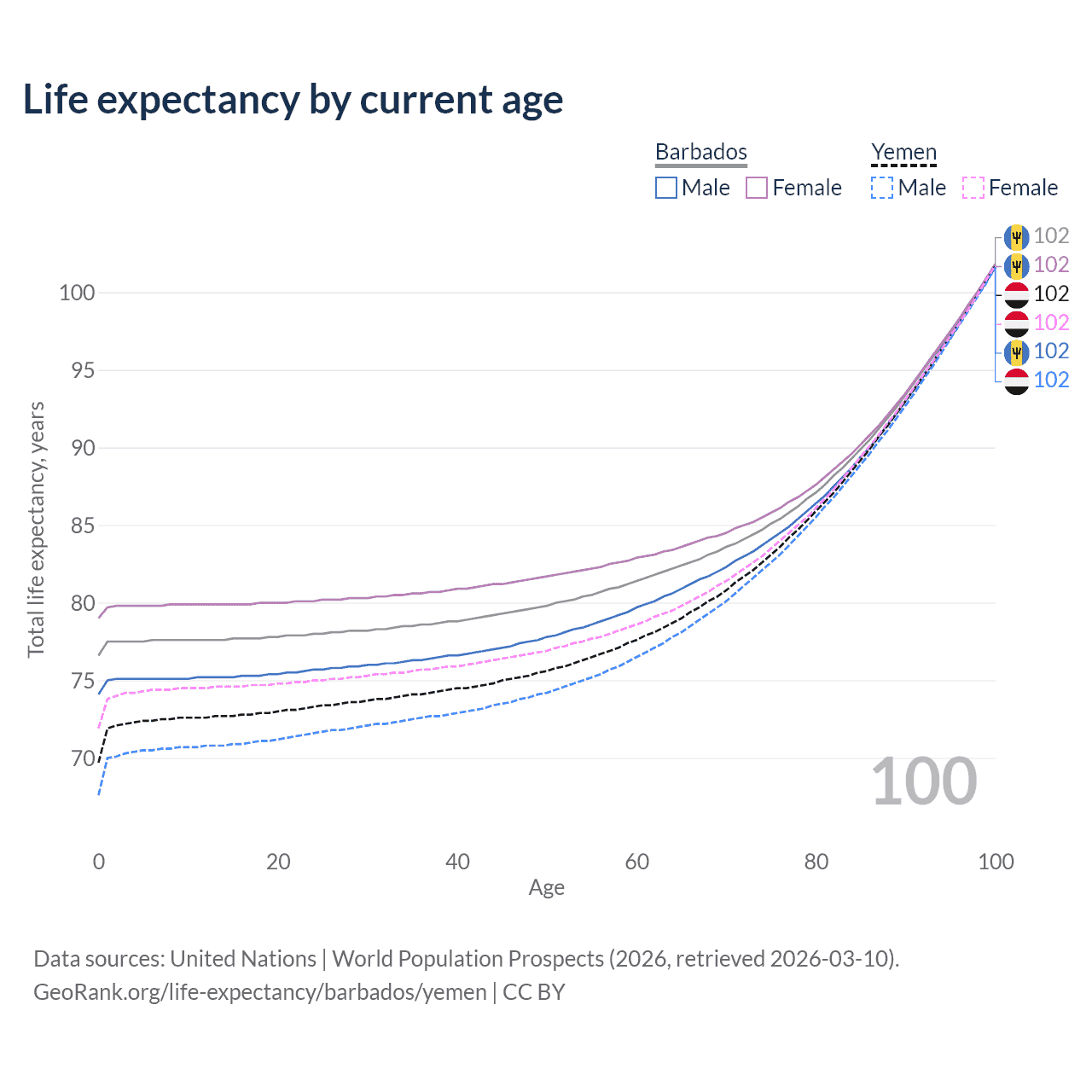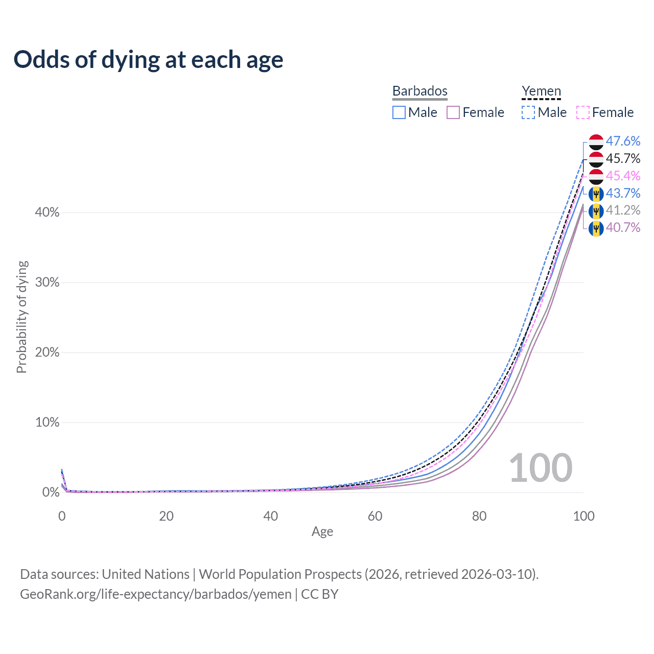 This life expectancy calculator shows the odds of living to 100, 95, 90, and below based on current age for both males and females in Barbados and Yemen, along with mean and median age of death. The calculations are based on the 2026 life tables (actuarial tables) from the UN World Population Prospects.