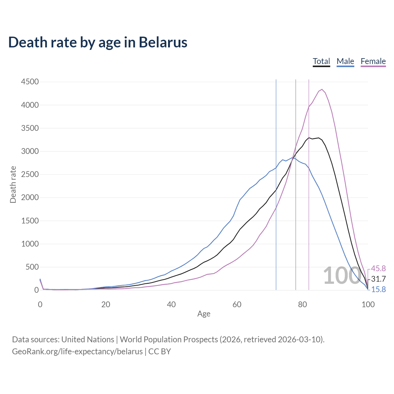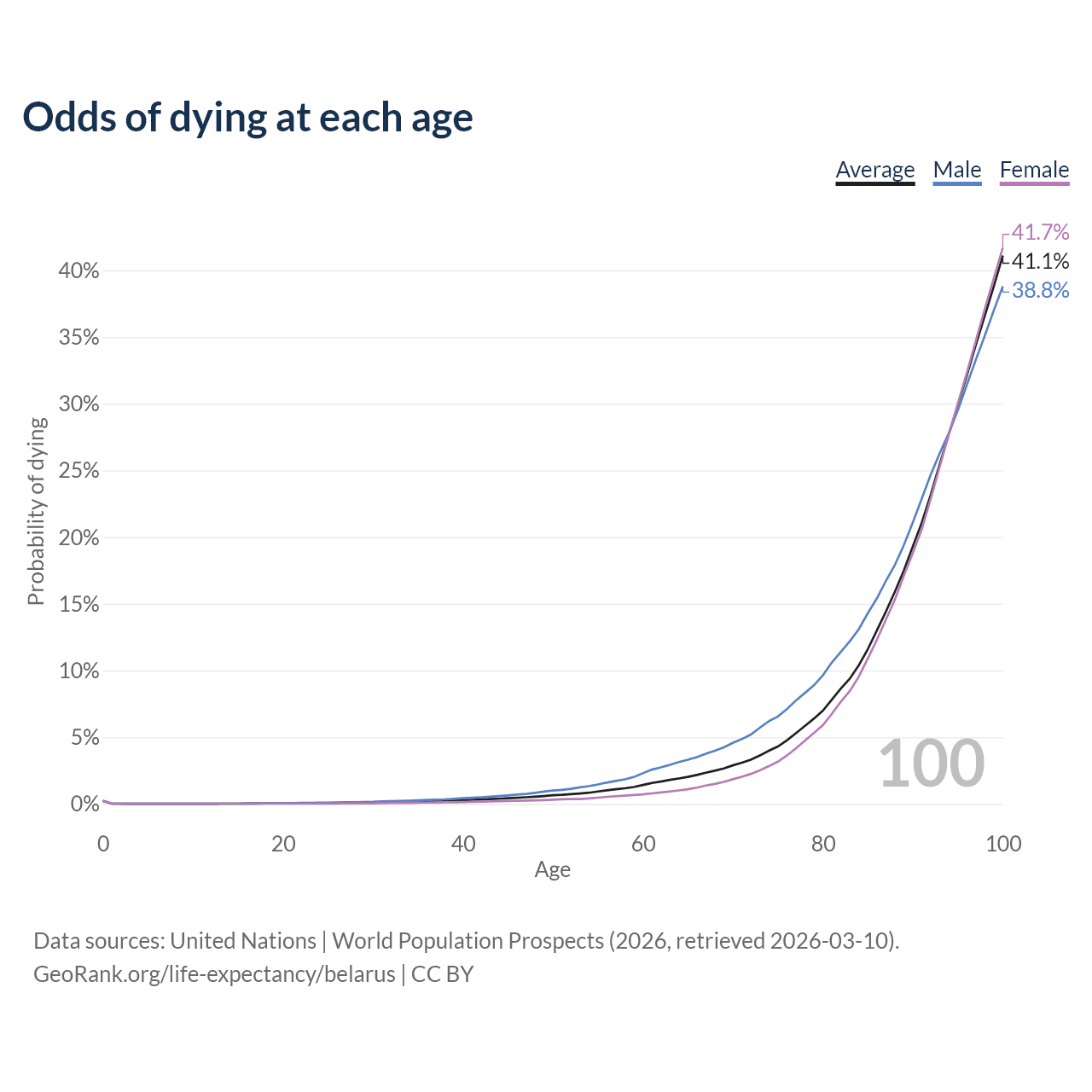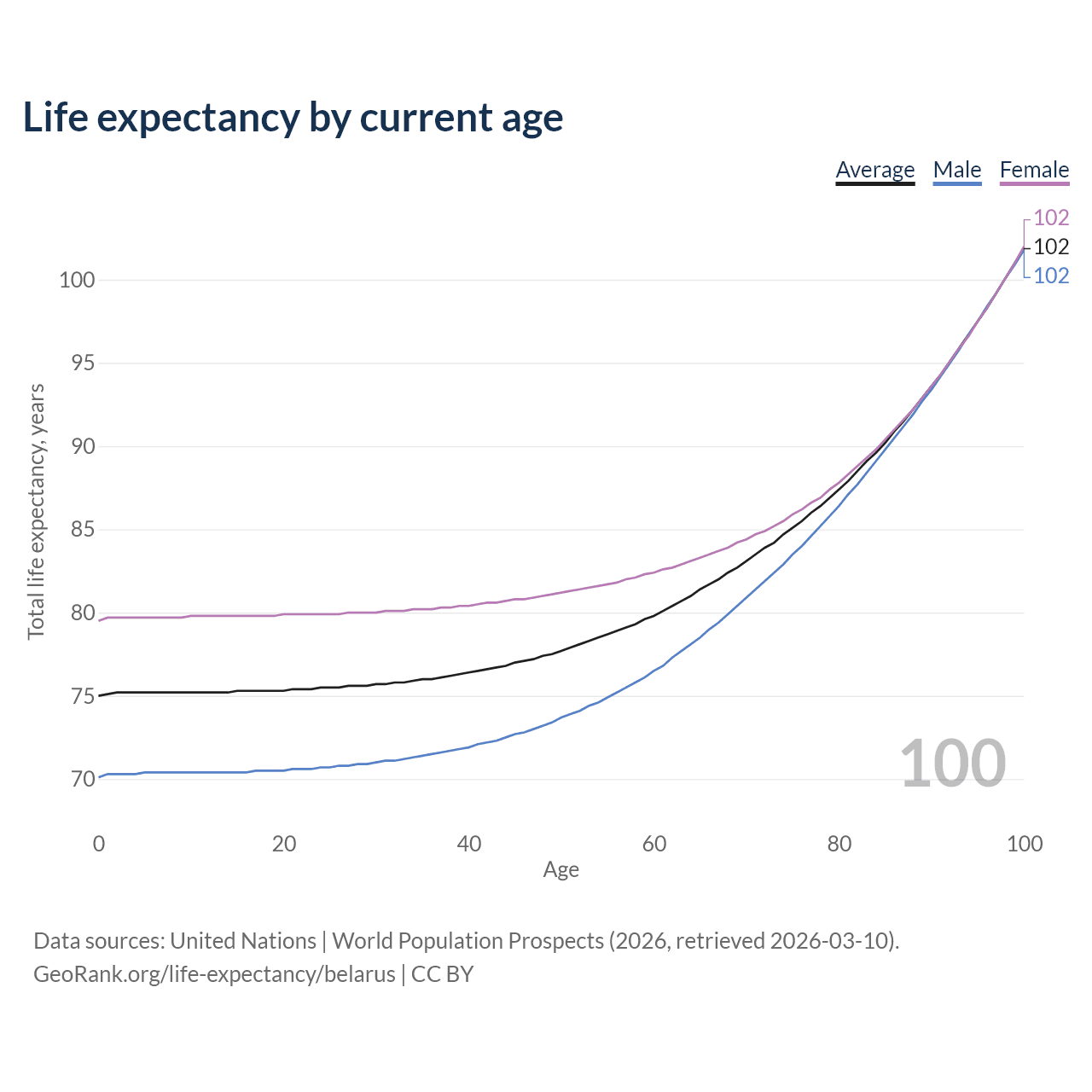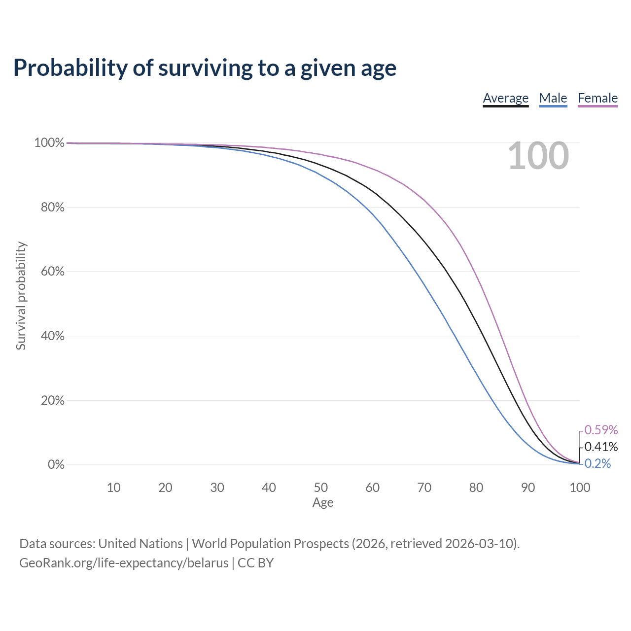 This life expectancy calculator shows the odds of living to 100, 95, 90, and below based on current age for both males and females in Belarus, along with mean and median age of death. The calculations are based on the 2026 life tables (actuarial tables) from the UN World Population Prospects.