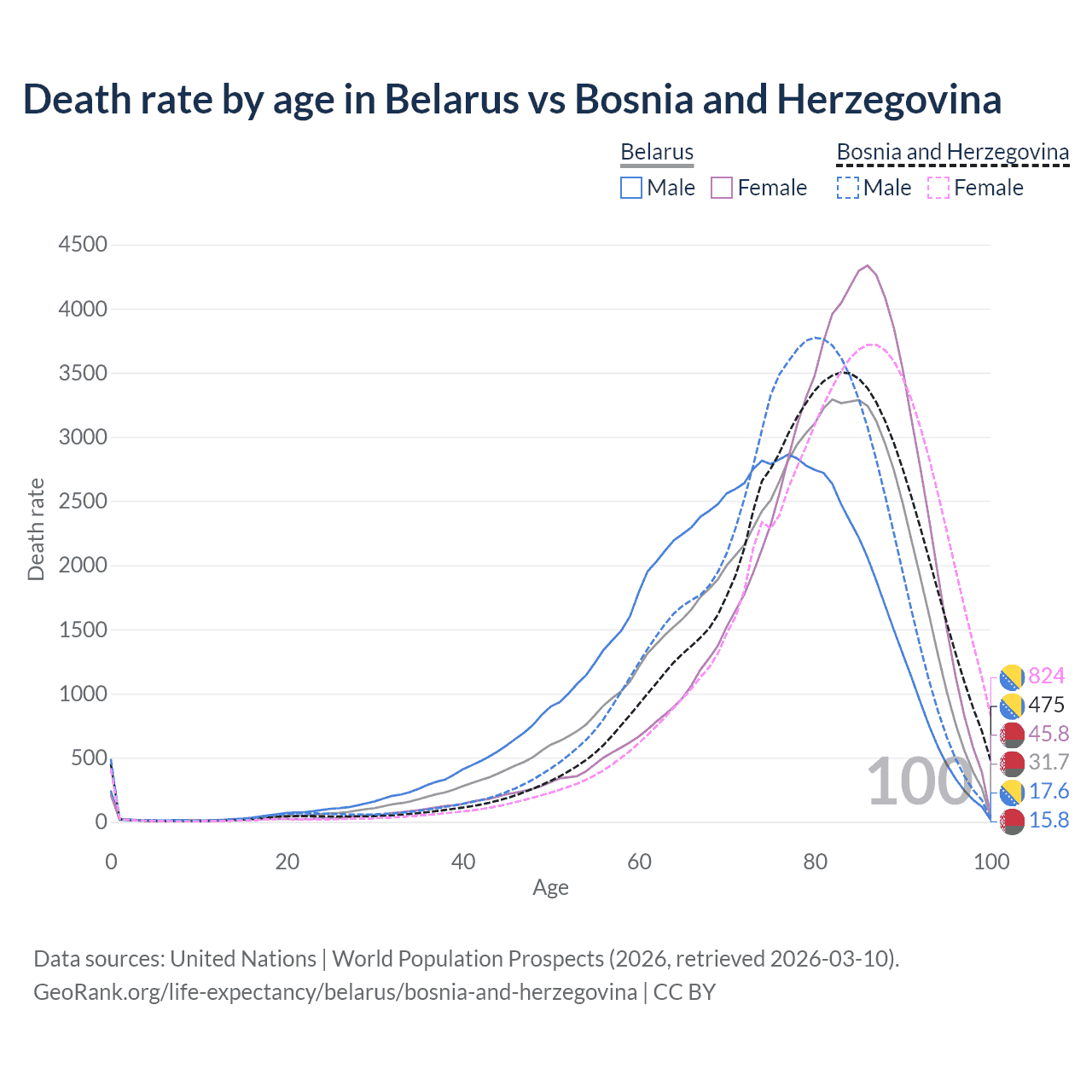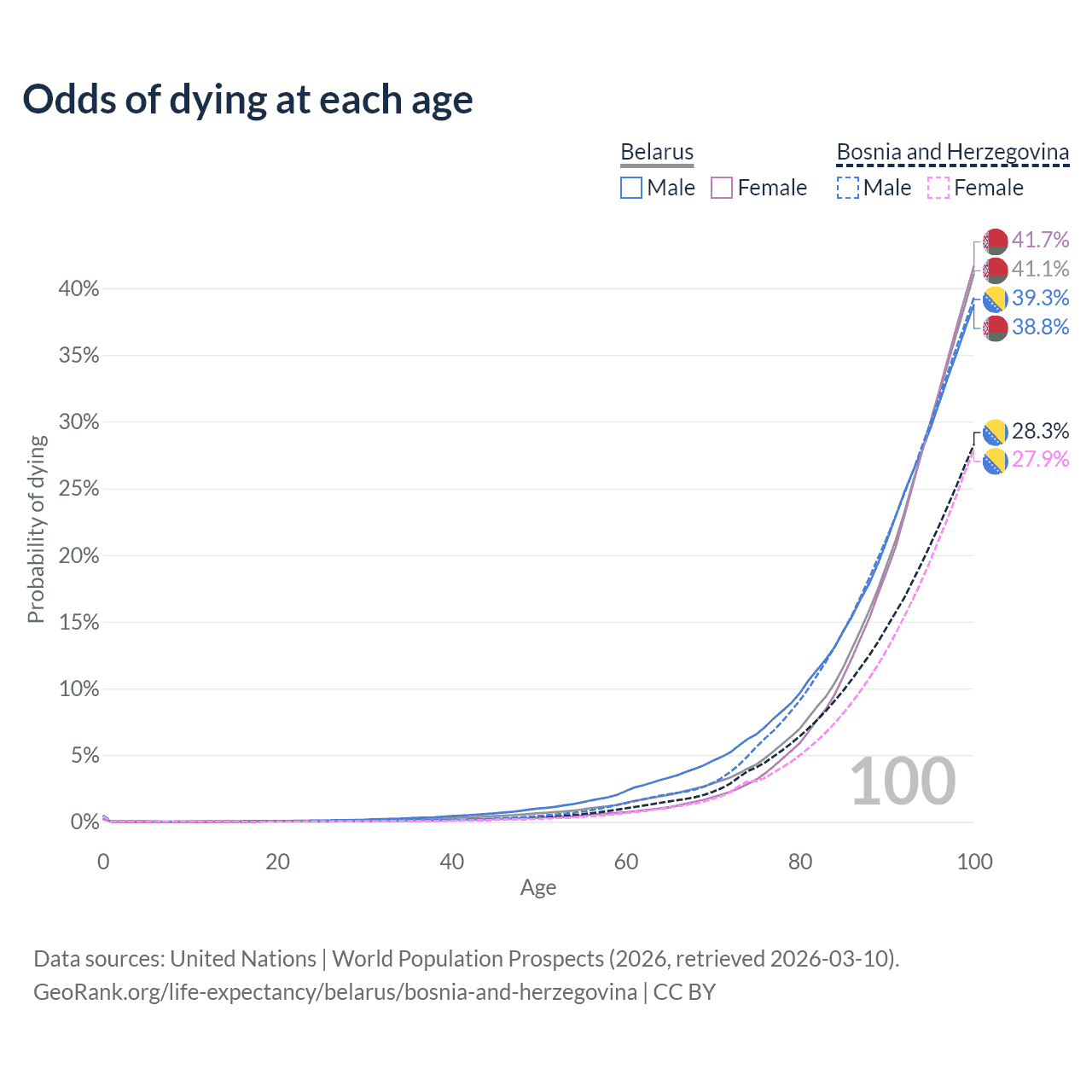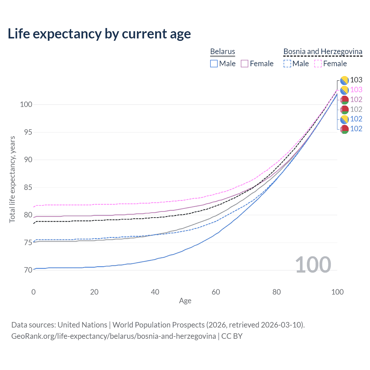 This life expectancy calculator shows the odds of living to 100, 95, 90, and below based on current age for both males and females in Belarus and Bosnia and Herzegovina, along with mean and median age of death. The calculations are based on the 2026 life tables (actuarial tables) from the UN World Population Prospects.