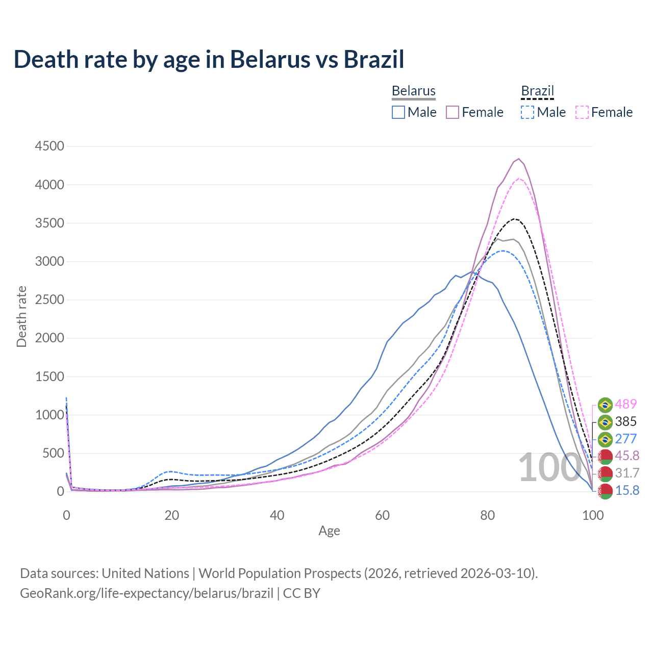 In Belarus, the most common age of death is 82, compared to 85 in Brazil. The median age of death is 78.1 in Belarus and 80.8 in Brazil, meaning only half of each cohort is expected to live past that age.