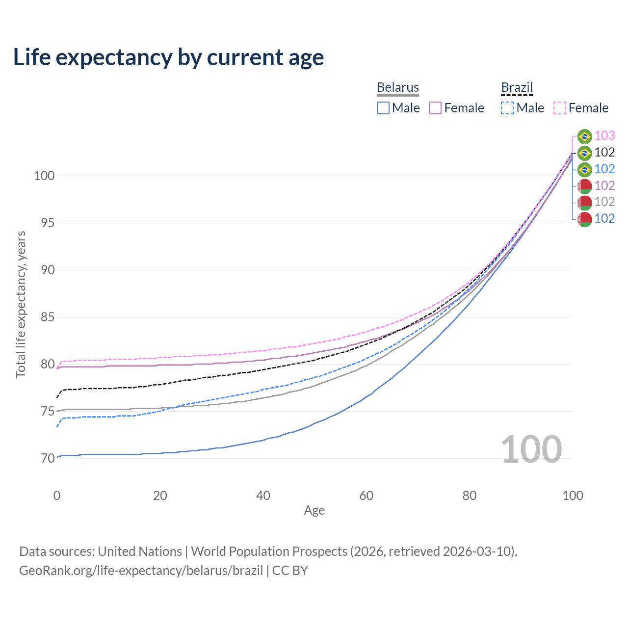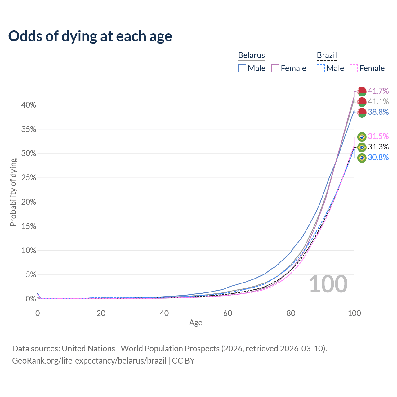 This life expectancy calculator shows the odds of living to 100, 95, 90, and below based on current age for both males and females in Belarus and Brazil, along with mean and median age of death. The calculations are based on the 2026 life tables (actuarial tables) from the UN World Population Prospects.
