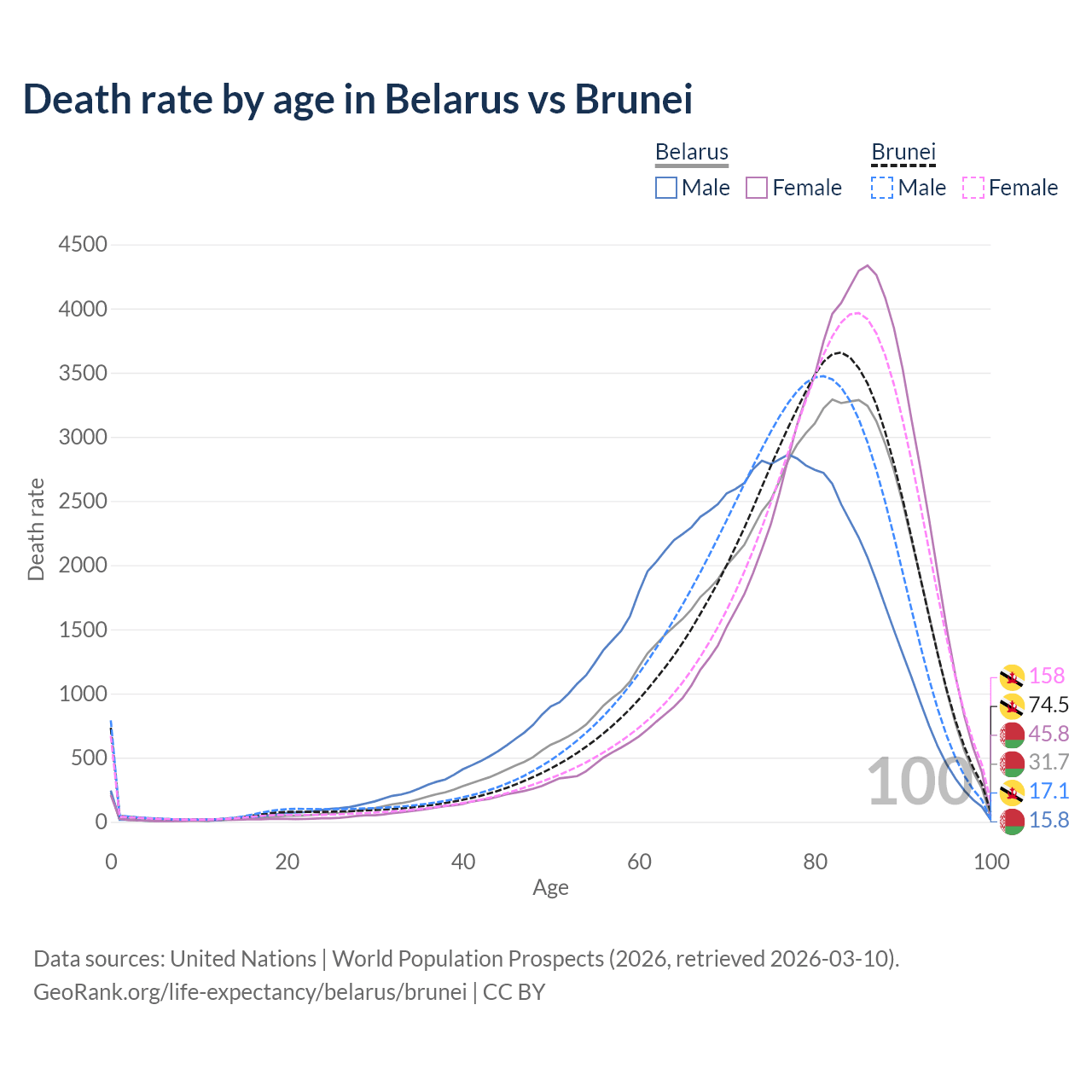 In Belarus, the most common age of death is 82, compared to 83 in Brunei. The median age of death is 78.1 in Belarus and 79.2 in Brunei, meaning only half of each cohort is expected to live past that age.