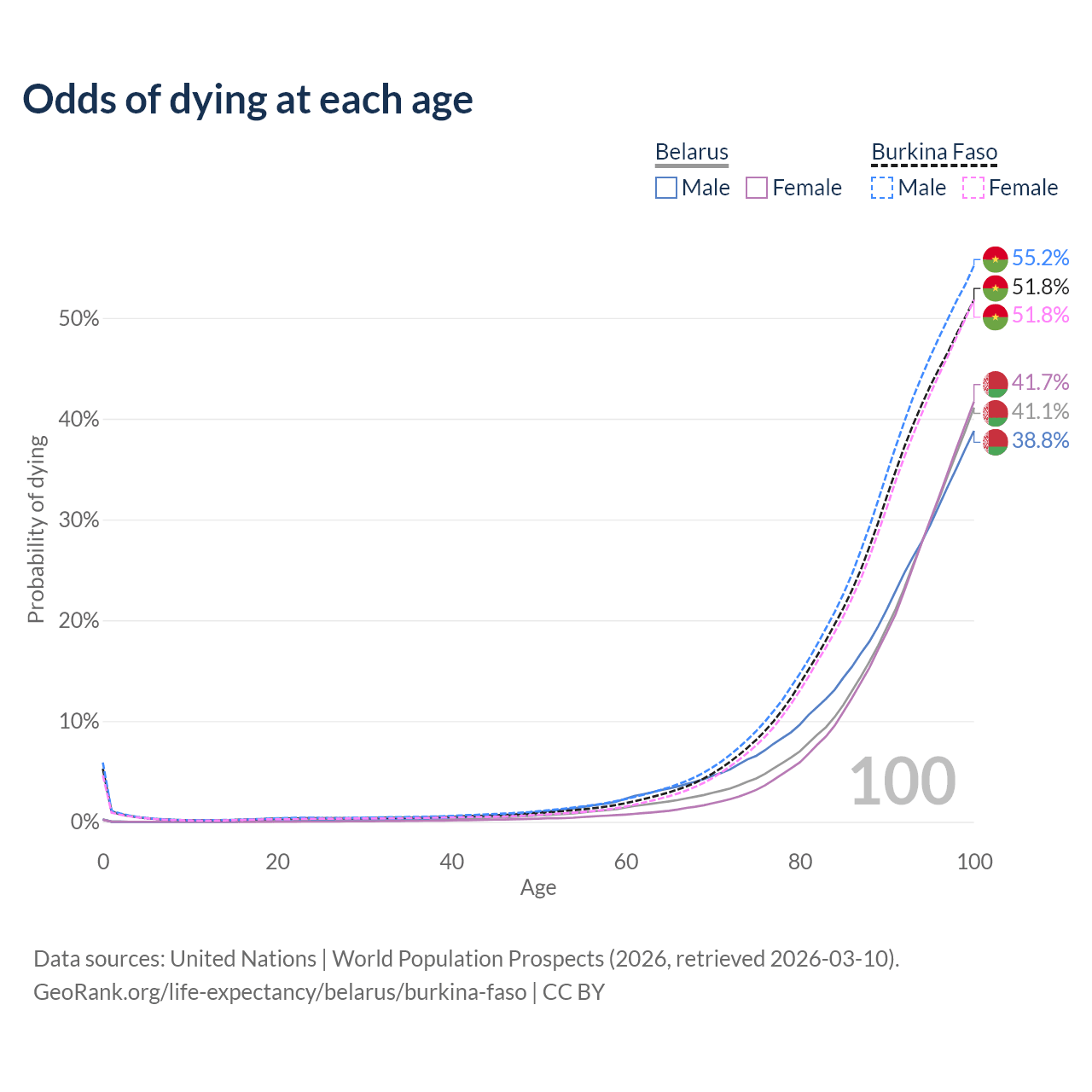 This life expectancy calculator shows the odds of living to 100, 95, 90, and below based on current age for both males and females in Belarus and Burkina Faso, along with mean and median age of death. The calculations are based on the 2026 life tables (actuarial tables) from the UN World Population Prospects.