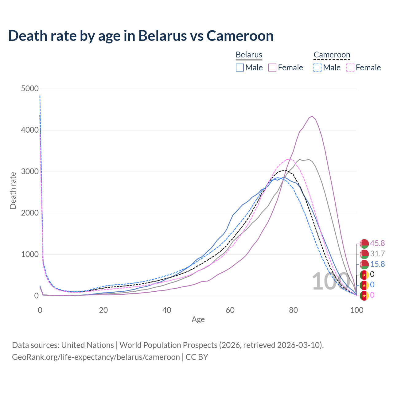 This life expectancy calculator shows the odds of living to 100, 95, 90, and below based on current age for both males and females in Belarus and Cameroon, along with mean and median age of death. The calculations are based on the 2026 life tables (actuarial tables) from the UN World Population Prospects.