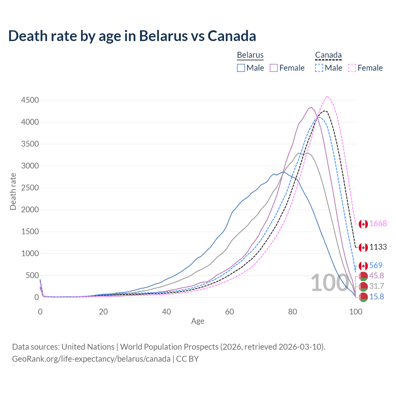 This life expectancy calculator shows the odds of living to 100, 95, 90, and below based on current age for both males and females in Belarus and Canada, along with mean and median age of death. The calculations are based on the 2026 life tables (actuarial tables) from the UN World Population Prospects.
